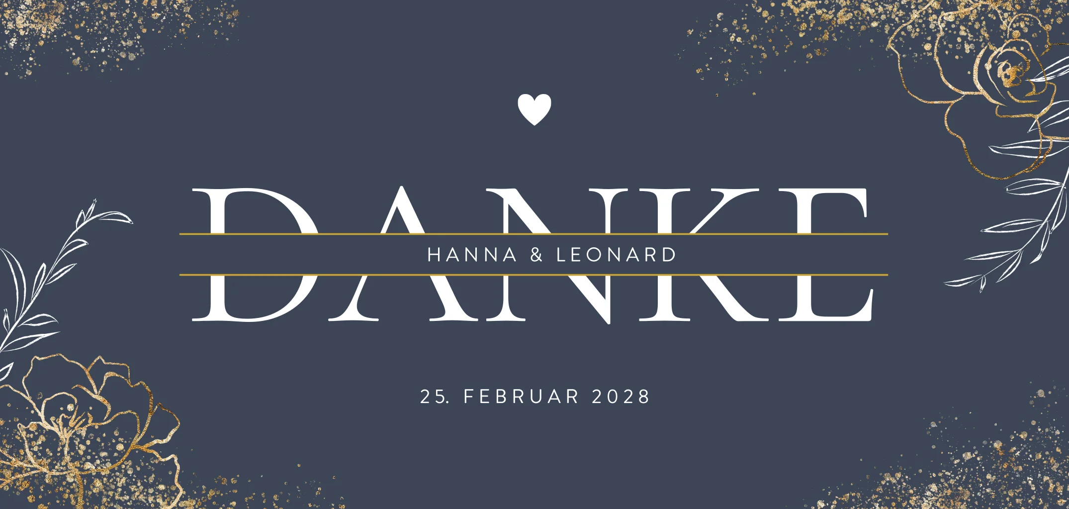 Nach eurem großen Tag möchtet ihr euch bei den Gästen für ihr Kommen bedanken. Nichts macht mehr Spaß als eine schöne passende Dankeskarte im Stil eurer Hochzeitskarte. Dieses stilvolle Design mit Spritzern und goldenen Blumen passt perfekt zu "Blue Hip Wedding Invitation with Initials and Golden Flowers". Die Karte ist mit Blättern verziert. Auf der Rückseite ist Platz für ein Foto eures glücklichen Tages.Melde dich für unseren Newsletter an und profitiere von exklusiven Angeboten, kreativen Ideen und Neuigkeiten aus unserer Produktwelt. Als Dankeschön für deine Anmeldung schenken wir dir einen kostenlosen Probedruck deiner Karte.