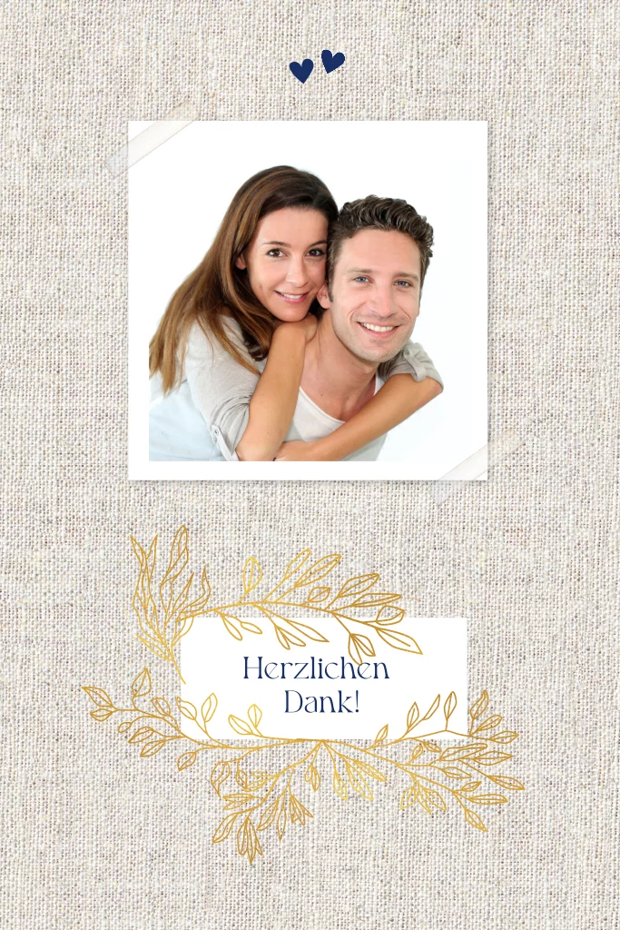 Eine wunderschöne Danksagungskarte mit goldenen Zweigen und einem Hintergrund in Leinenoptik. Diese Karte hat ein weißes Etikett, das von kleinen goldenen Zweigen umgeben ist. Schicken Sie diese Karte an die Gäste Ihrer Hochzeit, um ihnen für ihr Kommen und für ihre schönen Worte zu danken. Sie können ein ganzes Haus dieser Karte bei uns bestellen.Melde dich für unseren Newsletter an und profitiere von exklusiven Angeboten, kreativen Ideen und Neuigkeiten aus unserer Produktwelt. Als Dankeschön für deine Anmeldung schenken wir dir einen kostenlosen Probedruck deiner Karte.
