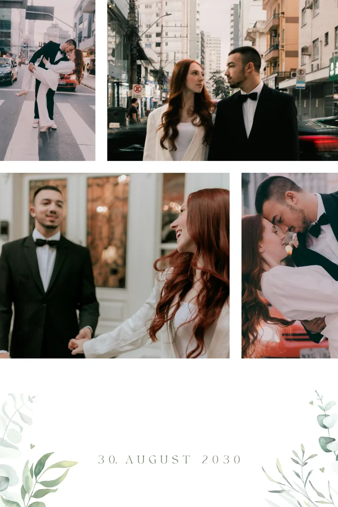 Diese elegante Danksagungskarte mit einer liebevoll zusammengestellten Fotocollage, schimmernder Goldfolie und feinen Aquarellzweigen ist der perfekte Weg, um dich stilvoll bei deinen Gästen für einen unvergesslichen Tag zu bedanken.