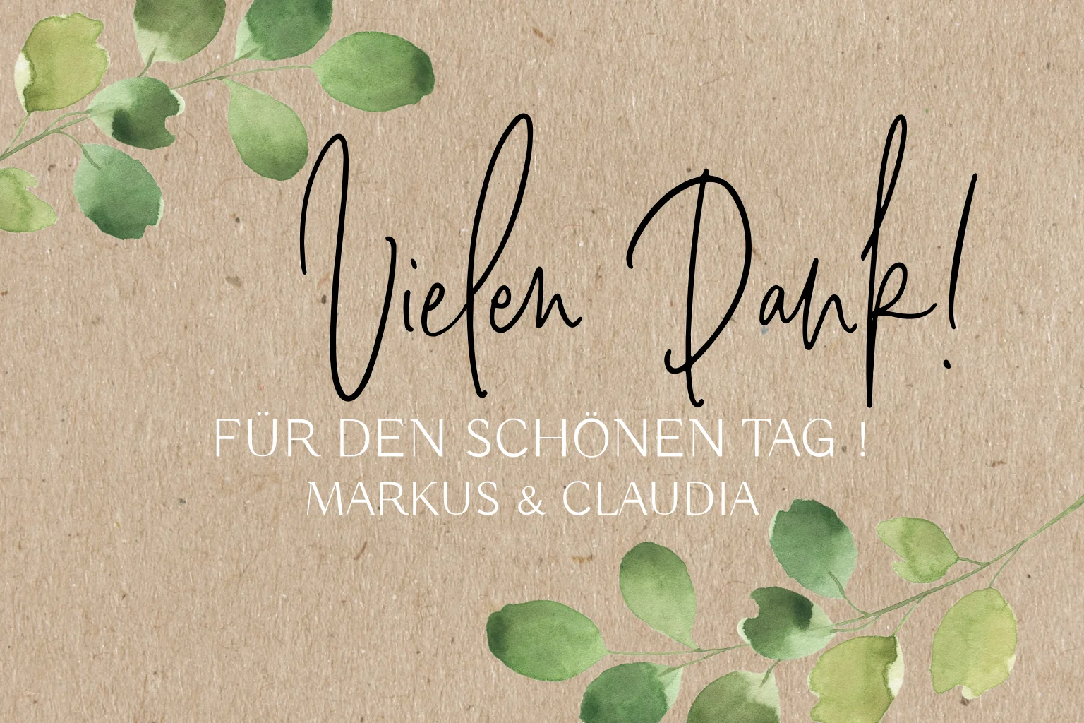 Stilvolle Hochzeits-Dankeskarte mit grünen Zweigen auf einem Kraft-Hintergrund.Melde dich für unseren Newsletter an und profitiere von exklusiven Angeboten, kreativen Ideen und Neuigkeiten aus unserer Produktwelt. Als Dankeschön für deine Anmeldung schenken wir dir einen kostenlosen Probedruck deiner Karte.