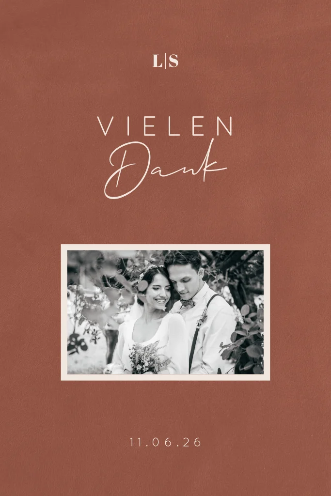 Spätestens, wenn nach den Flitterwochen der Alltag einkehrt, ist es Zeit, Danke zu sagen. Und womit könnte das charmanter gelingen als mit einer eleganten Karte mit einem Foto des glücklichen Brautpaars? Diese doppelseitige Danksagungskarte hat einen stilvollen Braunton und abegrundete Ecken.Melde dich für unseren Newsletter an und profitiere von exklusiven Angeboten, kreativen Ideen und Neuigkeiten aus unserer Produktwelt. Als Dankeschön für deine Anmeldung schenken wir dir einen kostenlosen Probedruck deiner Karte.