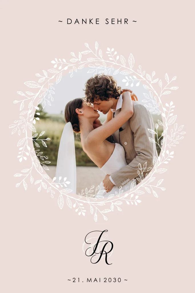 Nostalgische Danksagungskarte mit Foto im Blumenkranz.Melde dich für unseren Newsletter an und profitiere von exklusiven Angeboten, kreativen Ideen und Neuigkeiten aus unserer Produktwelt. Als Dankeschön für deine Anmeldung schenken wir dir einen kostenlosen Probedruck deiner Karte.