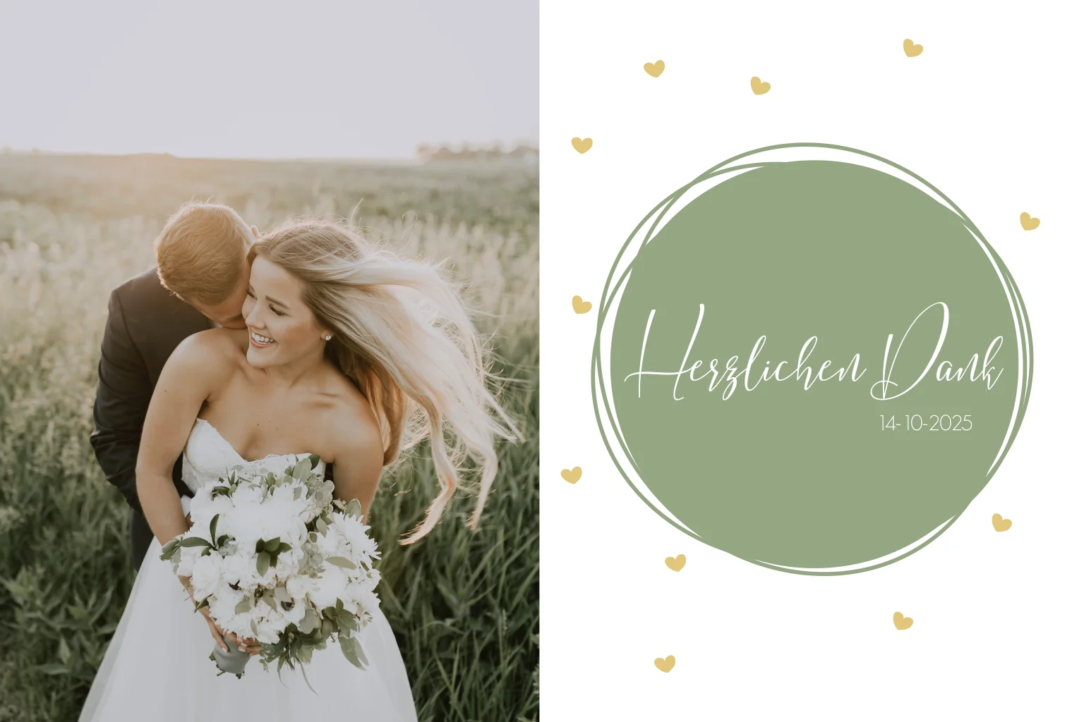 Romantische Dankeskarte für eure Hochzeitsgäste mit süßen goldgelben Herzen und grünen Details. Setzt ein wundervolles Foto eurer Trauung auf die Vorderseite und verfasst einen eigenen Text - schon versendet ihr mit dieser Karte ein ganz persönliches Dankeschön an eure Gäste!Melde dich für unseren Newsletter an und profitiere von exklusiven Angeboten, kreativen Ideen und Neuigkeiten aus unserer Produktwelt. Als Dankeschön für deine Anmeldung schenken wir dir einen kostenlosen Probedruck deiner Karte.