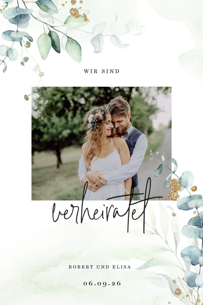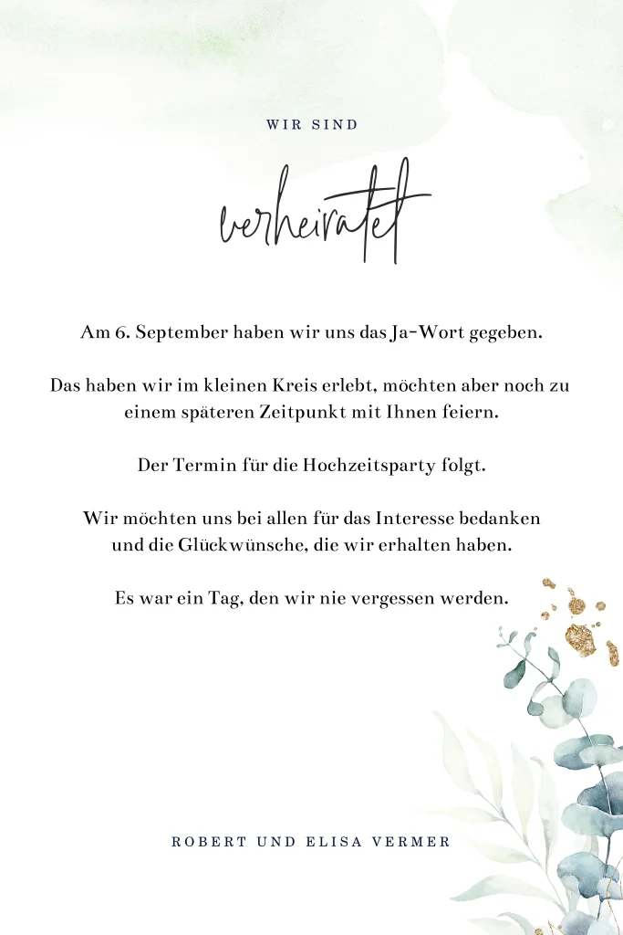 Seid ihr schon verheiratet und feiert ihr später? Mit dieser Karte kombiniert ihr beide Ereignisse perfekt.Melde dich für unseren Newsletter an und profitiere von exklusiven Angeboten, kreativen Ideen und Neuigkeiten aus unserer Produktwelt. Als Dankeschön für deine Anmeldung schenken wir dir einen kostenlosen Probedruck deiner Karte.