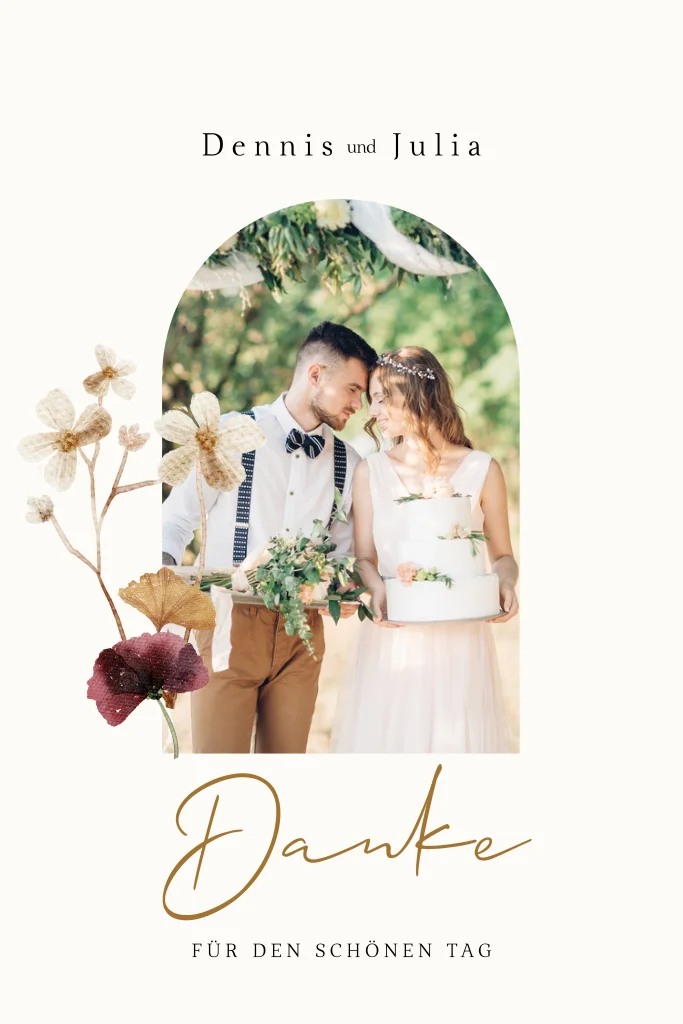 Vervollständigt diese stilvolle Dankeskarte mit eurem eigenen Foto vom schönsten Tag in Eures Lebens. Die Bogenform, Der weiße Hintergrund, die moderne Typografie und die zierlichen Blumen verleihen dieser Karte einen minimalistischen, aber schicken Look. Passt den Text im Online-Editor an.Melde dich für unseren Newsletter an und profitiere von exklusiven Angeboten, kreativen Ideen und Neuigkeiten aus unserer Produktwelt. Als Dankeschön für deine Anmeldung schenken wir dir einen kostenlosen Probedruck deiner Karte.