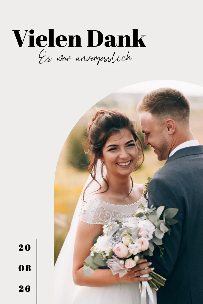 Hochzeitsdanksagungskarten sollten am besten 2-8 Wochen nach der Hochzeit verschickt werden. Dann hattet ihr bereits Zeit, alle Geschenke auszupacken und euren Gästen persönlich zu danken – außerdem könnt ihr eure Danksagungen mit den schönsten Fotos der Trauung und der Feier gestalten.Hast du schon die dazu passende Save the date Karte, Hochzeitskarte und Menükarte gesehen?