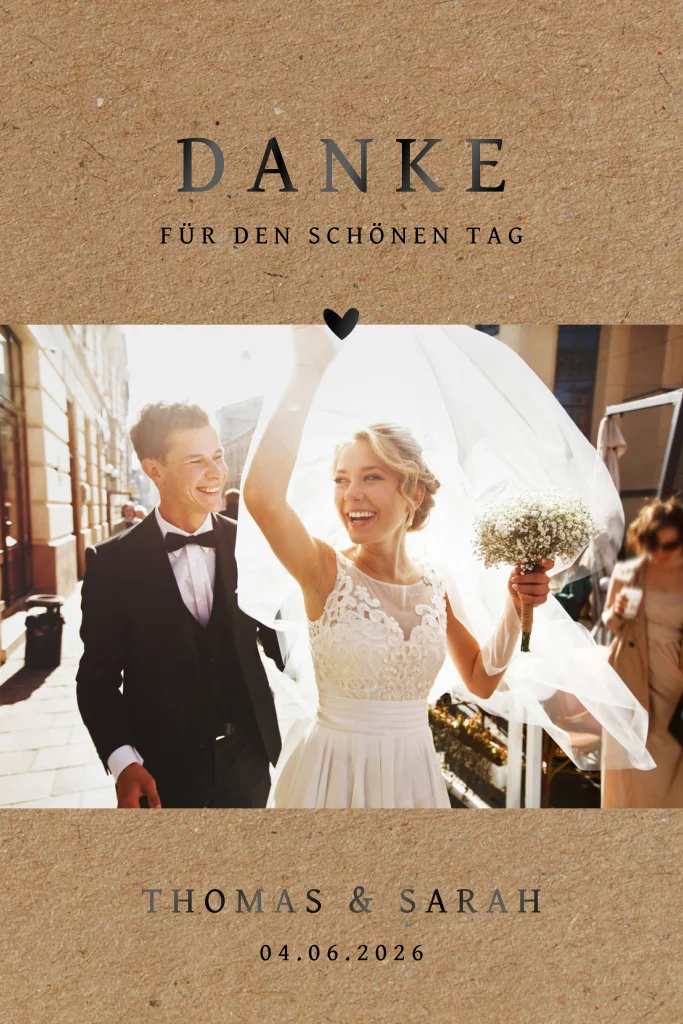 Bedankt euch bei euren Gästen für das möglich machen eines perfekten Tages. Mit eurem schönsten Foto eine tolle Erinnerung. Vervollständigt diese moderne Dankeskarte mit eurem eigenen Stil.Melde dich für unseren Newsletter an und profitiere von exklusiven Angeboten, kreativen Ideen und Neuigkeiten aus unserer Produktwelt. Als Dankeschön für deine Anmeldung schenken wir dir einen kostenlosen Probedruck deiner Karte.