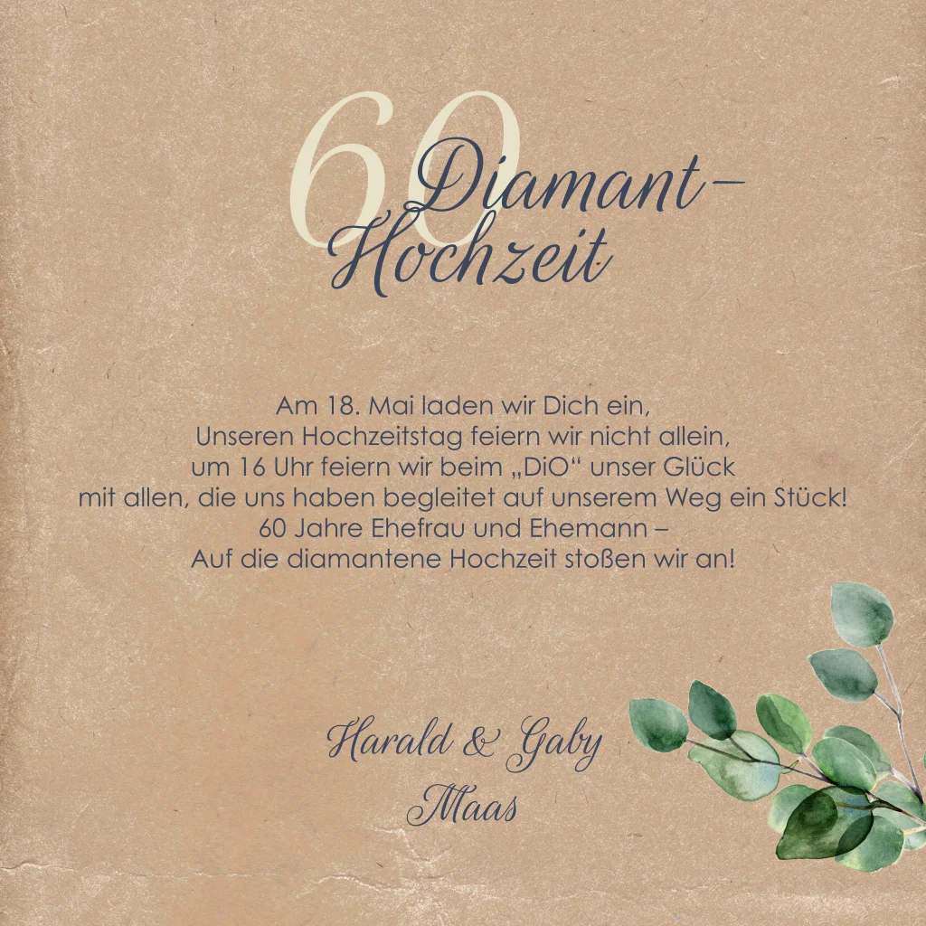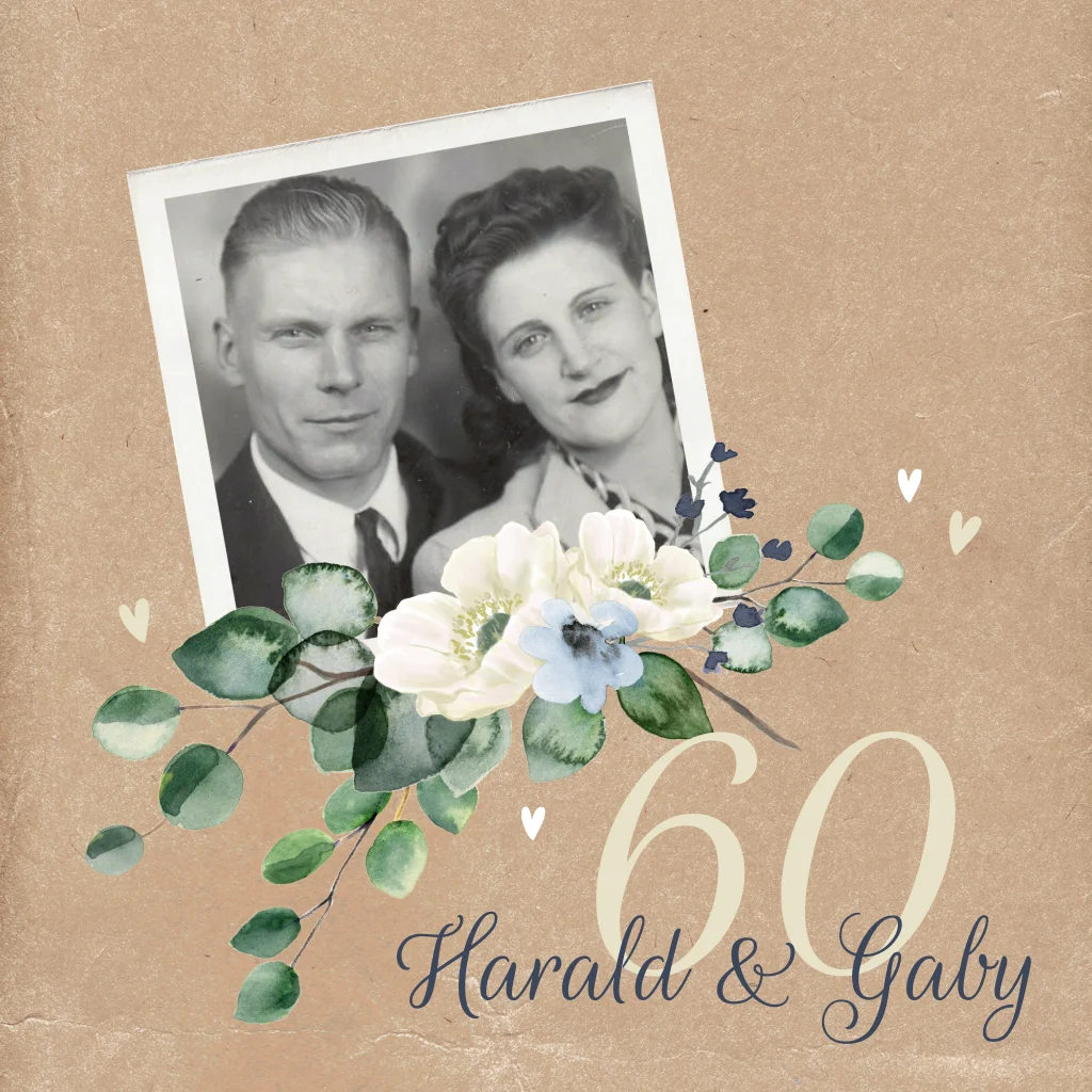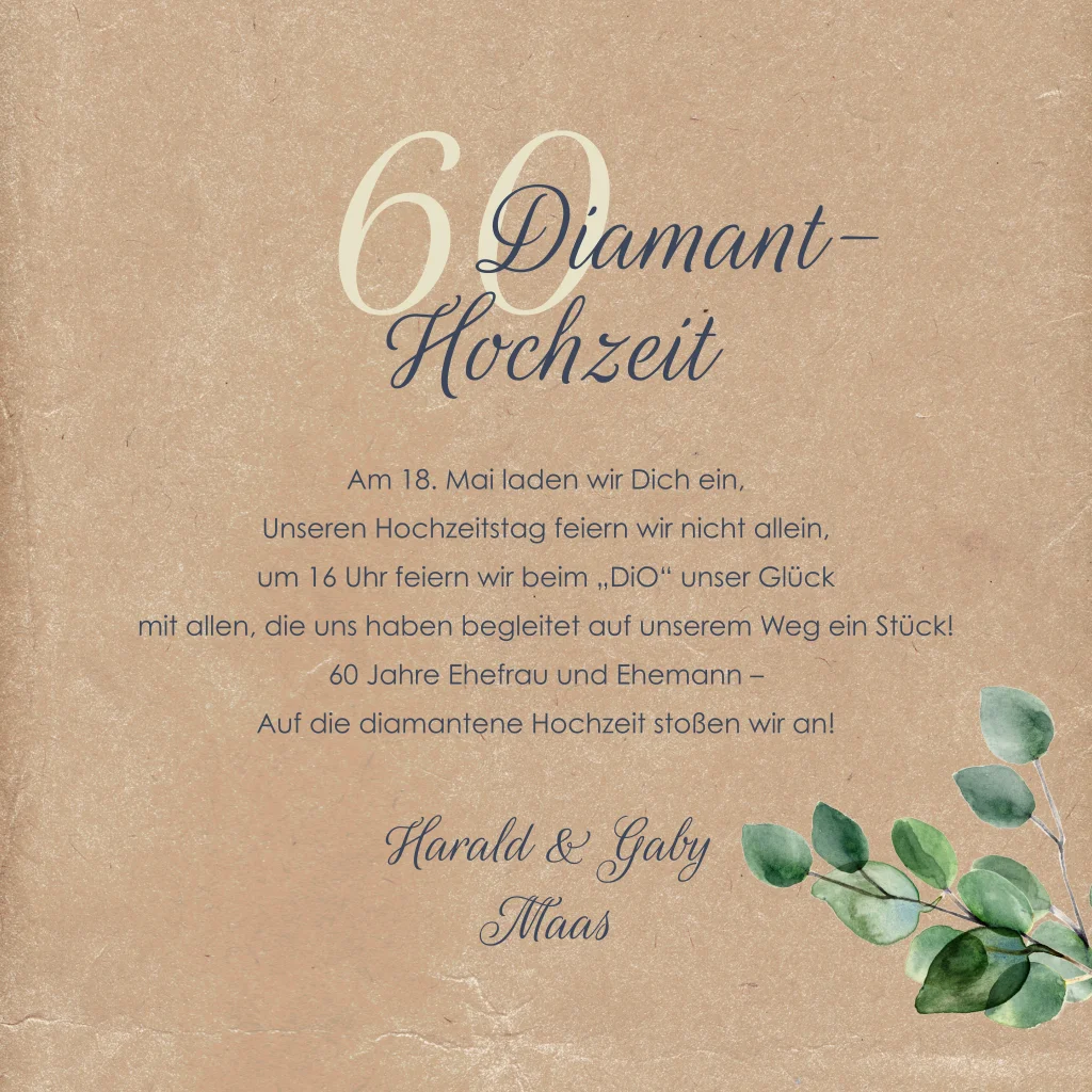 Einladung zur diamantenen Hochzeit im Kraftlook mit Blumen und Foto