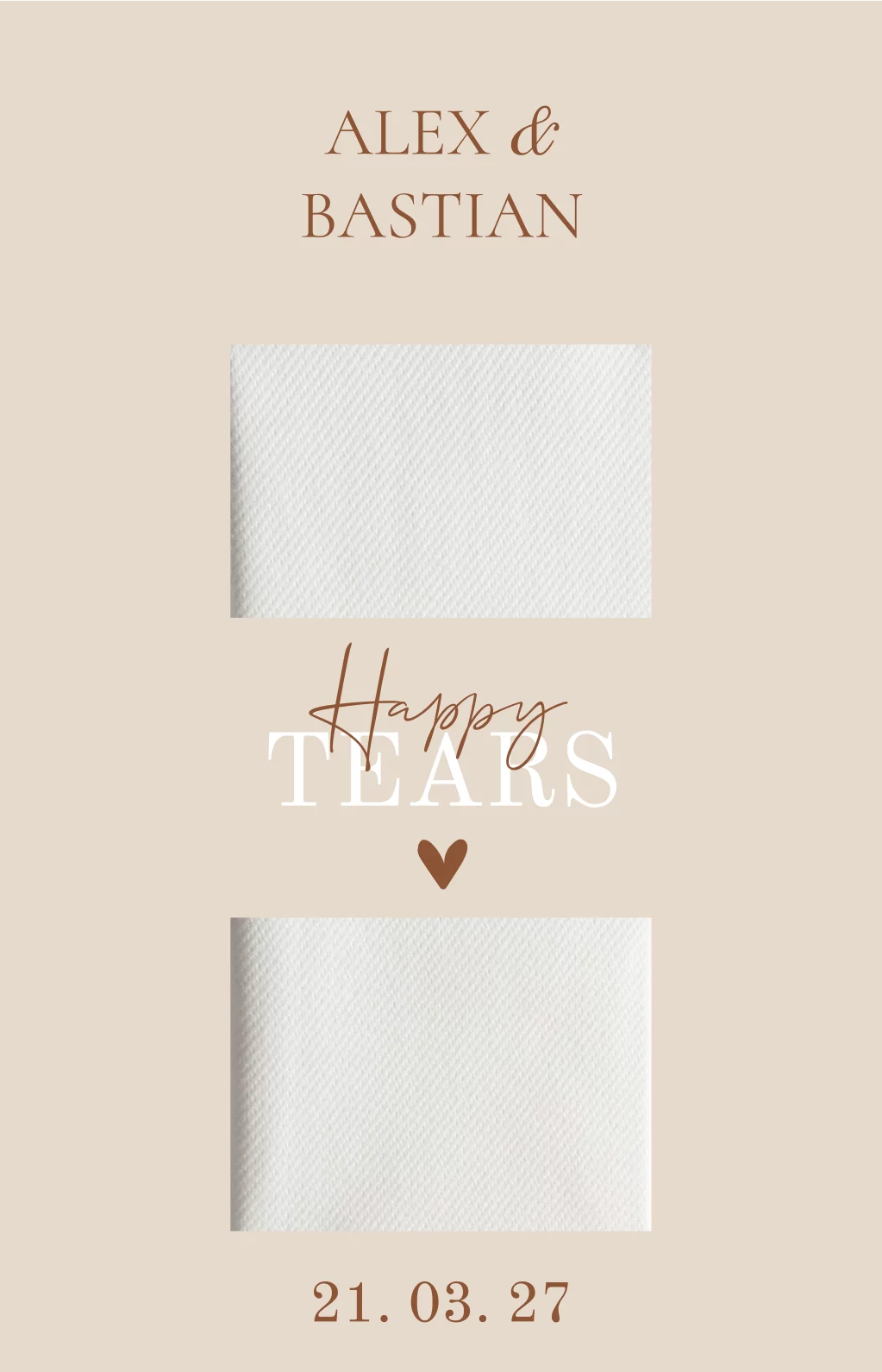 So originell: Überrasche deine Gäste und verteile diese Freudentränen-Einsteckkarten. Du kannst die Kärtchen auf den Stühlen für die Trauungszeremonie platzieren oder als Tagesprogramm-Kärtchen verwenden und zu Beginn des Tages verteilen.