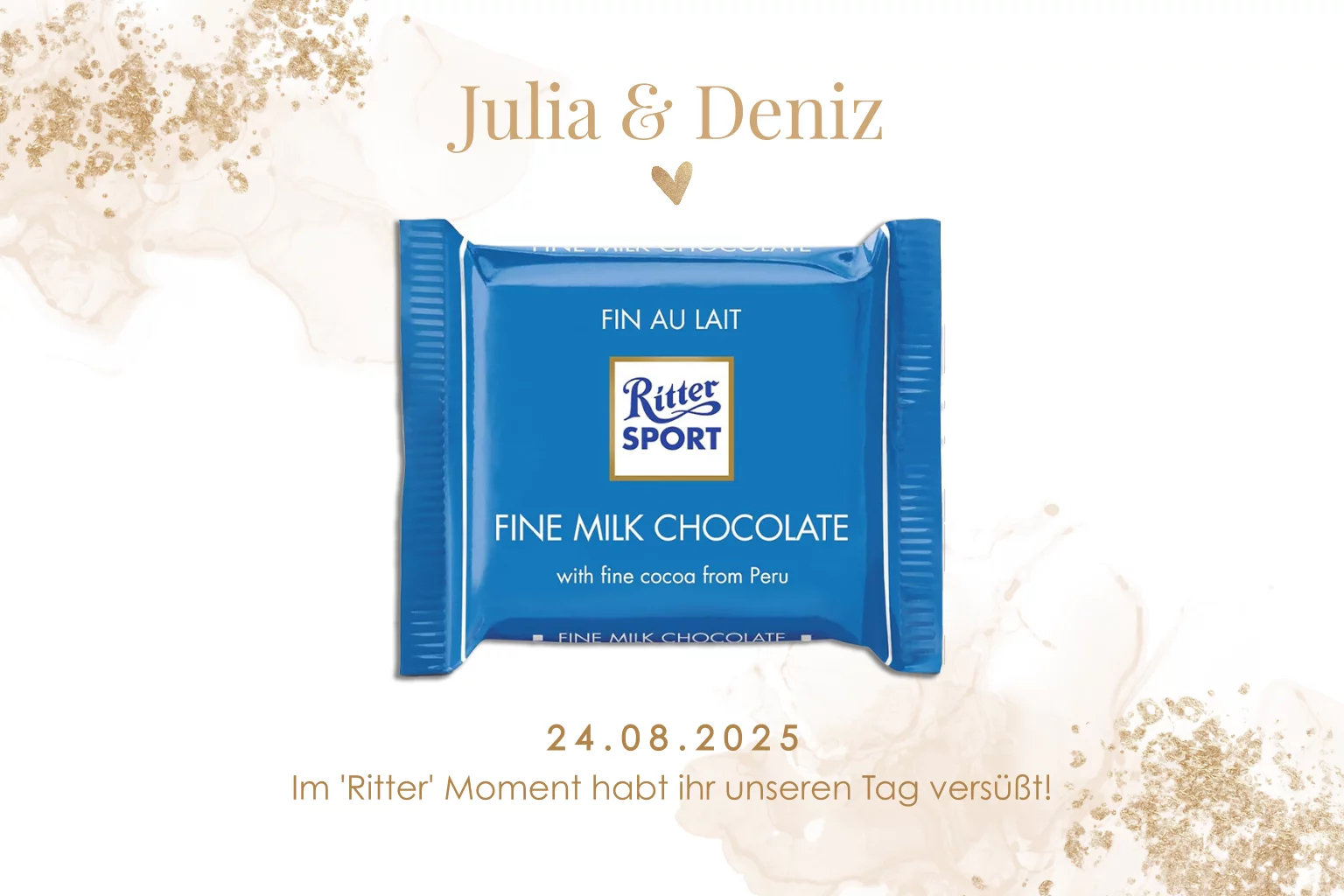 Wird ohne Schokolade geliefertDie Größenverhältnisse der Schokoladen auf den abgebildeten Karten sind passend für 10x15 cm Karten dargestellt. Eine Merci Schokolade ist 7,5x1,5 cm und Ritter Sport 4x4 cm groß. Natürlich können die Karten auch in anderen Größen, wie 11,4x17,1 cm, bestellt werden, wodurch die Größenverhältnisse dann etwas anders ausfallen.