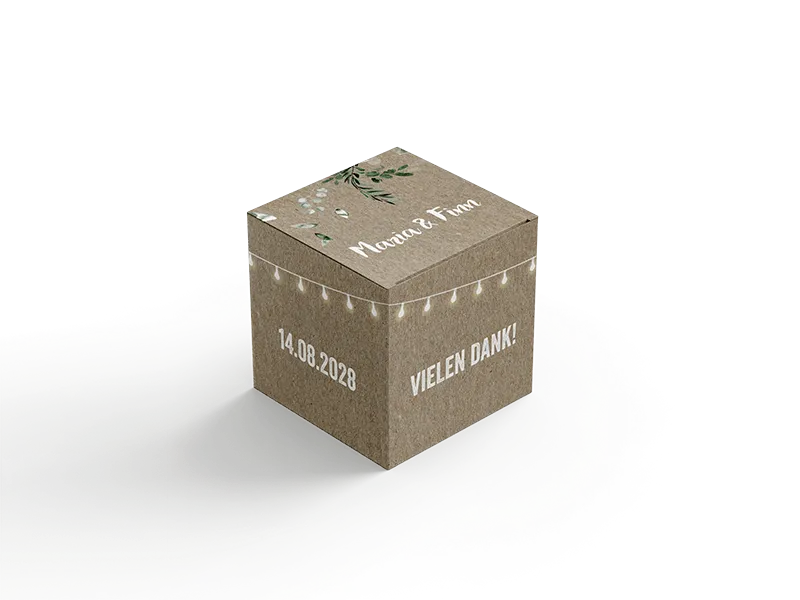 Die Box ist 5 cm hoch, breit und tief und wird ungefaltet geliefert.