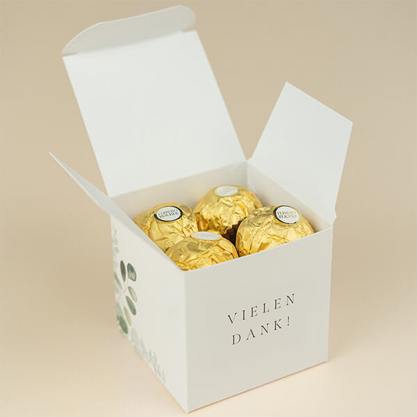 Die Box ist 5 cm hoch, breit und tief und wird ungefaltet geliefert.