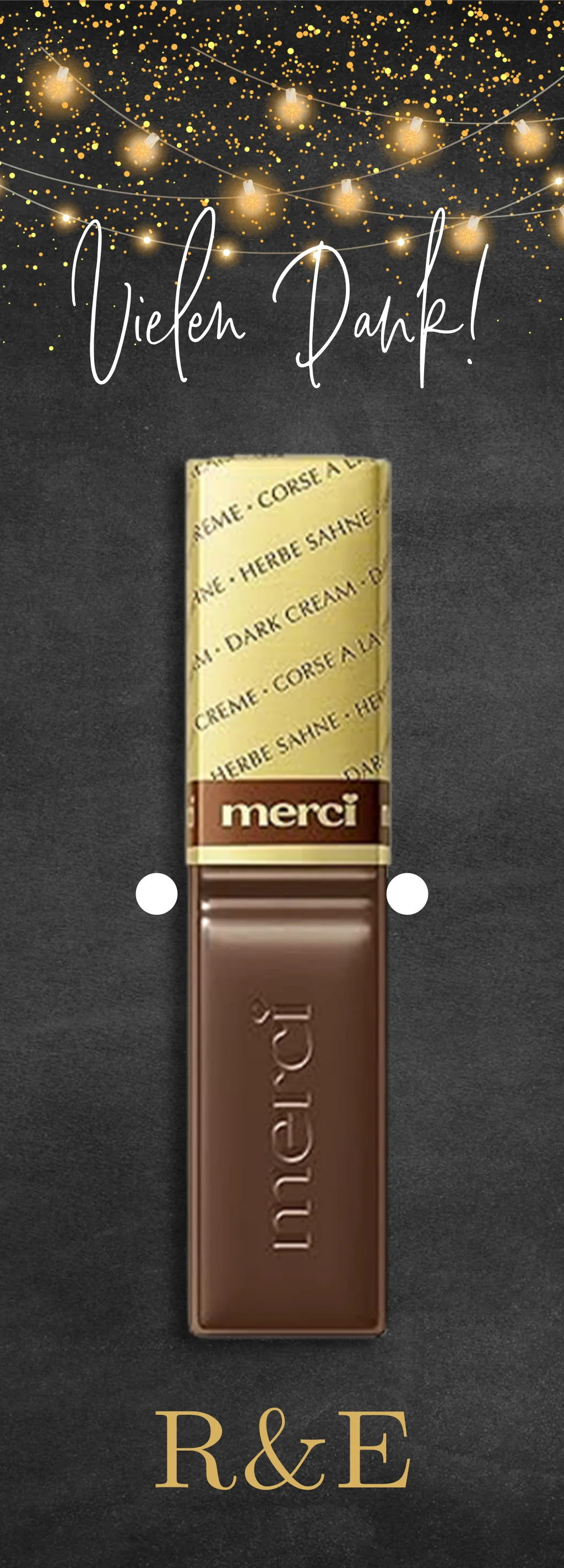 Wird ohne Schokolade geliefert.Merci Gastgeschenk mit Lichterketten auf schwarzem Hintergrund. Die abgebildete Karte hat eine Größe von 15x5,4 cm. Eine Merci Schokolade ist 7,5x1,5 cm und Ritter Sport 4x4 cm groß. Die abgebildeten Größenverhältnisse von Schokolade zu Karte sind passend. Die Schokolade kann mithilfe einer Schnur an der Karte befestigt werden. Die Schnur und die Schokolade sind nicht in der Bestellung inbegriffen, wobei die Schnur dazu bestellt werden kann.
