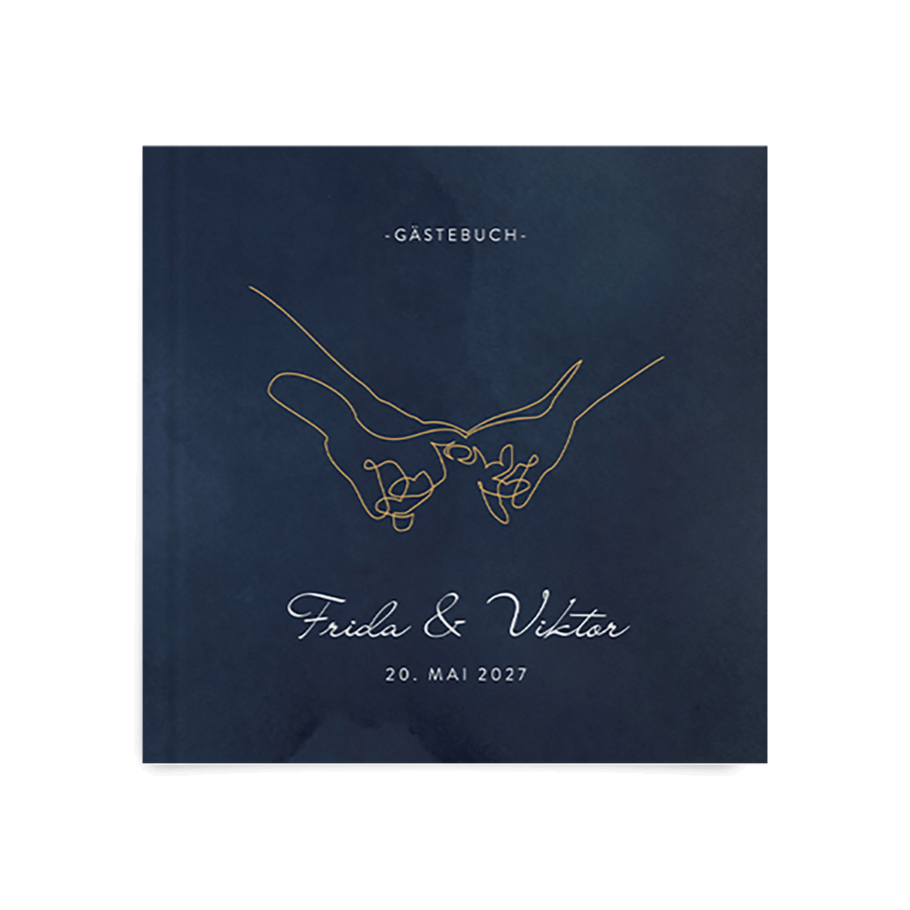 Eine wunderbare Erinnerung an Euren großen Tag ist ein Gästebuch zur Hochzeit, in das jeder Gast persönliche Zeilen schreibt und so die Erinnerung an die schönen Stunden noch nach vielen Jahren wieder lebendig werden lässt. Auf diesem schönen Gästebuch in dunkelblauer Farbe befindet sich auf der Vorderseite eine stilvolle Strichzeichnung zweier Hände; ein schönes Symbol der Liebe. Passt dieses Design in unserem praktischen Editor selbst an. Dieses Gästebuch passt perfekt zu unserer Hochzeitseinladung 'Dunkelblaue Hochzeitskarte mit Strichzeichnung von Händen in Goldfolie'. Achtung! Goldfolie kann auf Gästebüchern nicht verwendet werden, daher haben die Strichzeichnung und das Herz ohne Foliendruck eine goldgelbe Farbe.