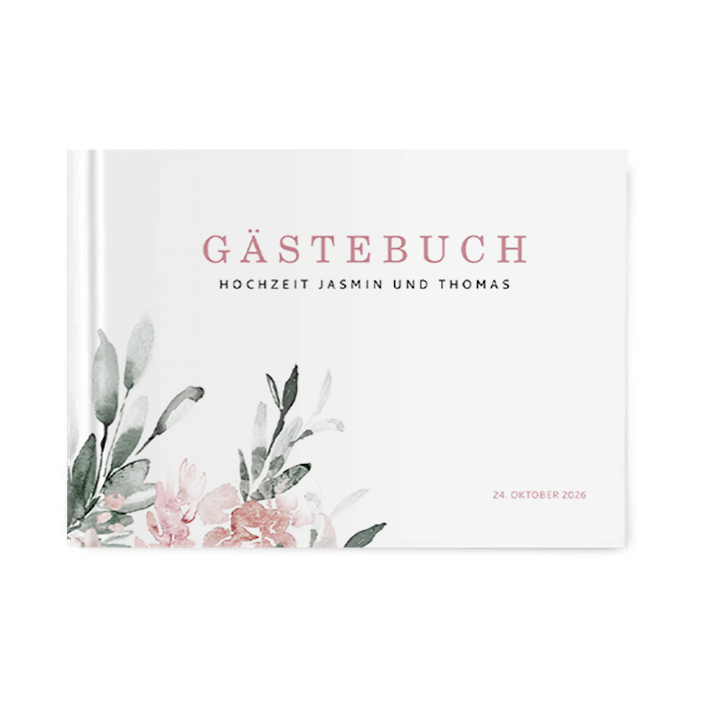 Stilvolles Gästebuch mit floralem Design und rosafarbenen Blüten im Aquarell-Look. Mit diesem Büchlein können deine Gäste dir liebevolle Wünsche und Tipps mitgeben.