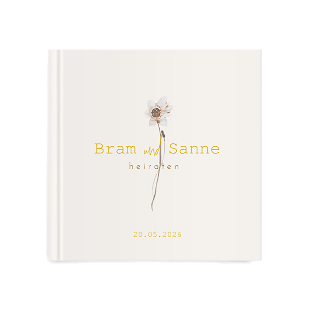 Dieses Gästebuch ist sowohl für eine Landhochzeit als auch die klassische Hochzeit geeignet. Eine minimalistische Blume verziert eure Namen. Ausgefallen, individuell und edel.