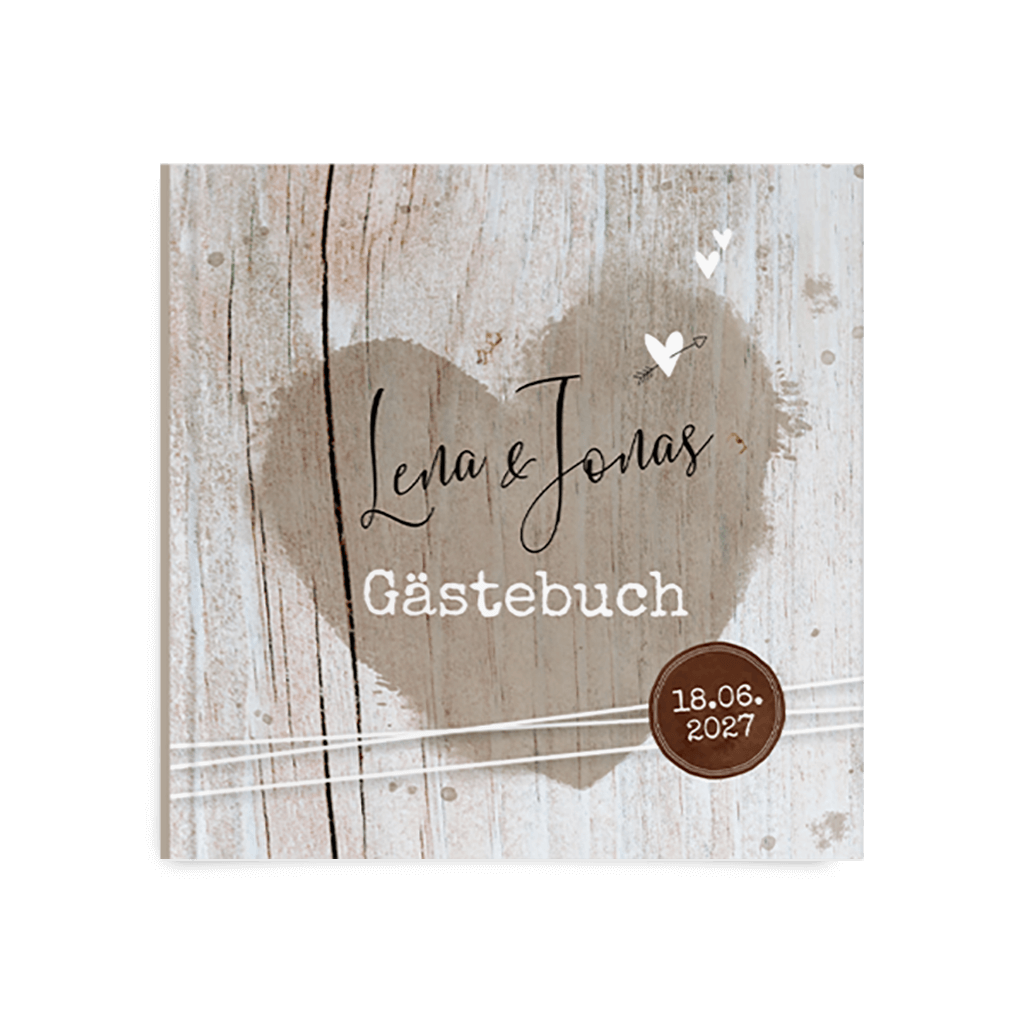 Stilvolles Gästebuch im Holzlook mit einem Herz, in dem die Namen des Hochzeitspaares stehen. Auf der Vorderseite (rechts Seite) befindet sich ein Label mit dem Hochzeitsdatum. Die Rückseite (linke Seite) prägen ein paar schlichte Herzchen. So können dir alle Geladenen ganz einfach kleine Nachrichten hinterlassen.| Gesamtpreis: 0 |