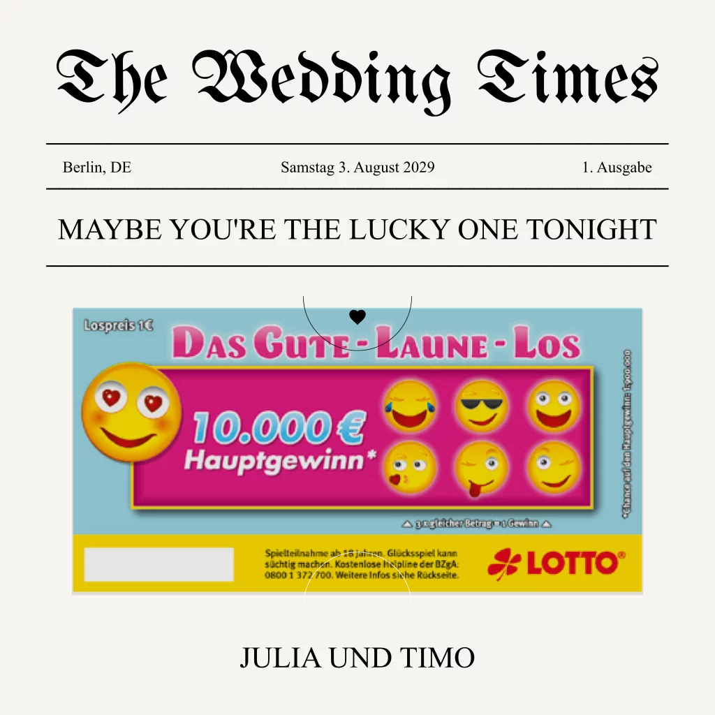Bitte beachte: Der Lottoschein dient lediglich als Beispiel und ist nicht als physisches Produkt enthaltenDas Design der von dir gewählten Karte wurde automatisch in andere Formate umgestellt. Wähle einfach deinen Wunschformat aus und platziere alle Texte und Elemente an der richtigen Stelle im Editor. Du hast Fragen oder dein Favorit steht nicht zur Auswahl? Dann kontaktiere uns bitte und wir werden uns gemeinsam darum kümmern!