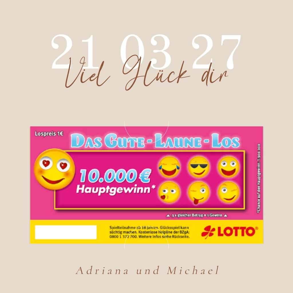 Bitte beachte: Der Lottoschein dient lediglich als Beispiel und ist nicht als physisches Produkt enthaltenDas Design der von dir gewählten Karte wurde automatisch in andere Formate umgestellt. Wähle einfach deinen Wunschformat aus und platziere alle Texte und Elemente an der richtigen Stelle im Editor. Du hast Fragen oder dein Favorit steht nicht zur Auswahl? Dann kontaktiere uns bitte und wir werden uns gemeinsam darum kümmern!