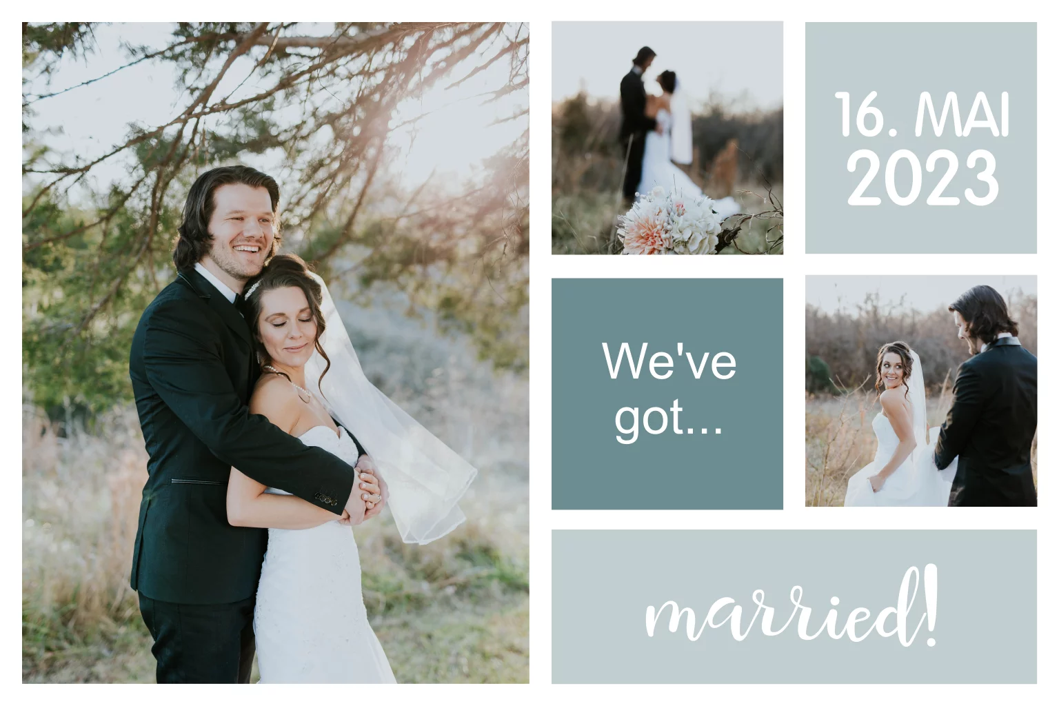 Lasst Freunde und Verwandte wissen, dass Ihr Euch das Ja-Wort gegeben habt – mit einer Karte mit Euren schönsten Hochzeitsfotos und einer Ausstrahlung, die zu Euch passt.Das Design der von dir gewählten Karte wurde automatisch in andere Formate umgestellt. Wähle einfach deinen Wunschformat aus und platziere alle Texte und Elemente an der richtigen Stelle im Editor. Du hast Fragen oder dein Favorit steht nicht zur Auswahl? Dann kontaktiere uns bitte und wir werden uns gemeinsam darum kümmern!