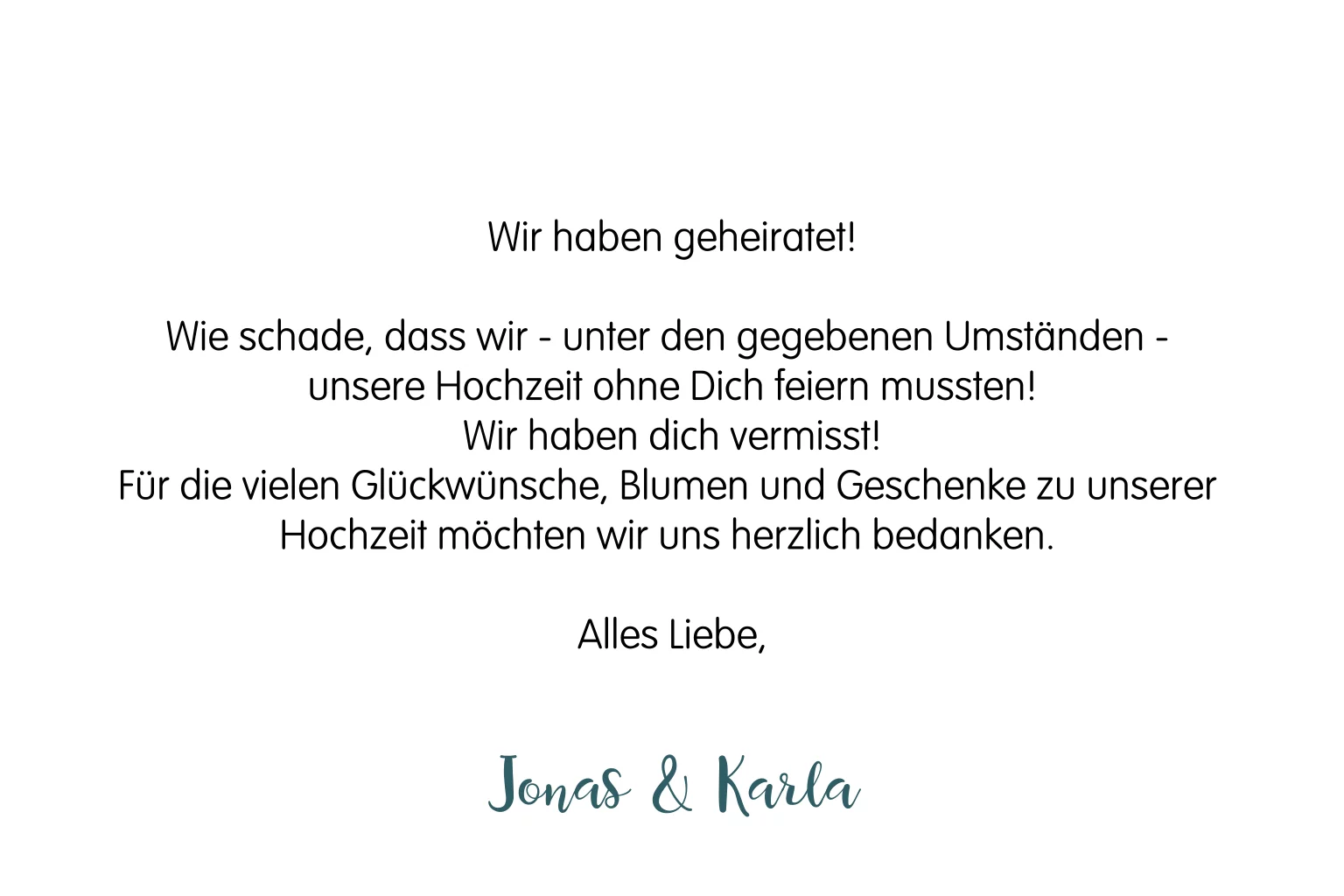 Lasst Freunde und Verwandte wissen, dass Ihr Euch das Ja-Wort gegeben habt – mit einer Karte mit Euren schönsten Hochzeitsfotos und einer Ausstrahlung, die zu Euch passt.Melde dich für unseren Newsletter an und profitiere von exklusiven Angeboten, kreativen Ideen und Neuigkeiten aus unserer Produktwelt. Als Dankeschön für deine Anmeldung schenken wir dir einen kostenlosen Probedruck deiner Karte.