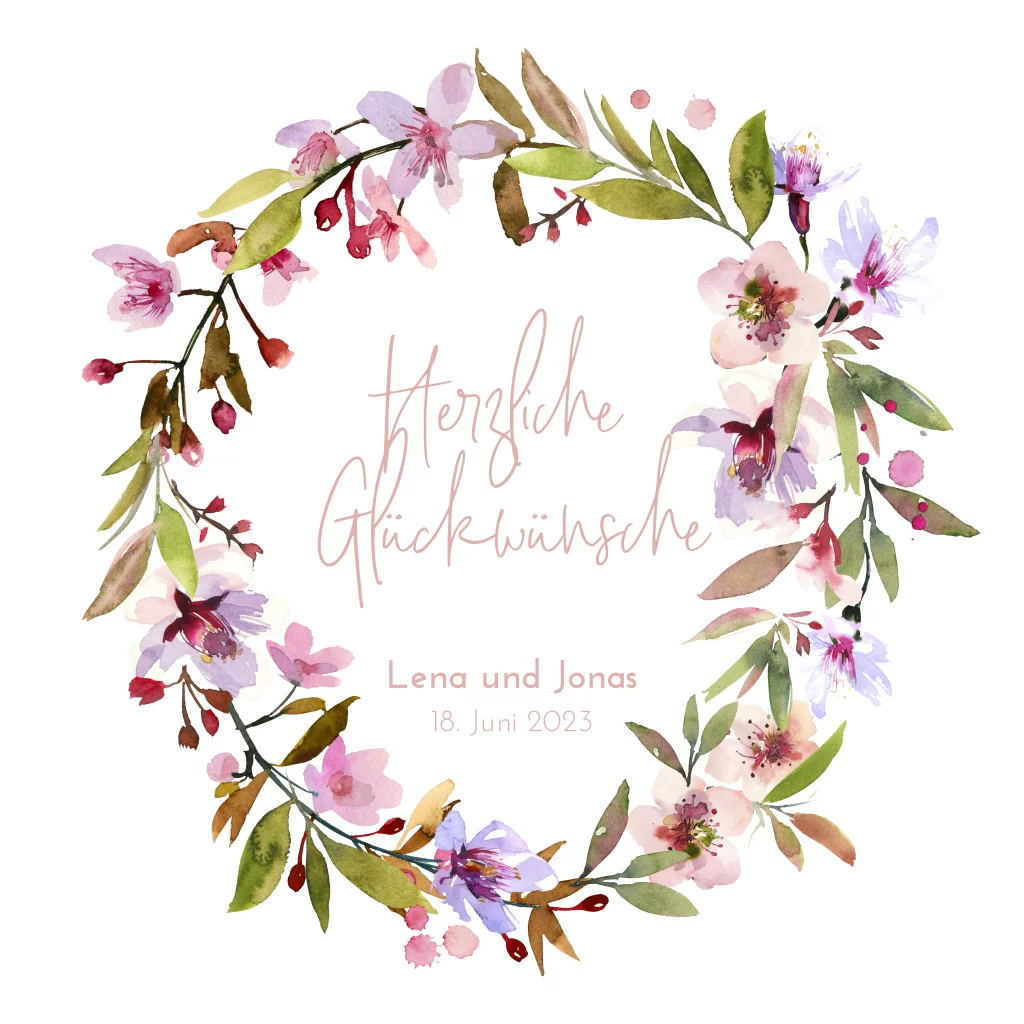 Elegante Gästebuchkarte mit buntem Blumenkranz auf weißem Hintergrund. Glückwunschkarten - Grußkarten für dein Gästebuch. Bestellt einige Karten im Stil eurer Einladung, damit die Gäste euch darin eine persönliche Nachricht zur Hochzeit schreiben können. Wir empfehlen die Größe 11x11 cm or 10x15 cm.