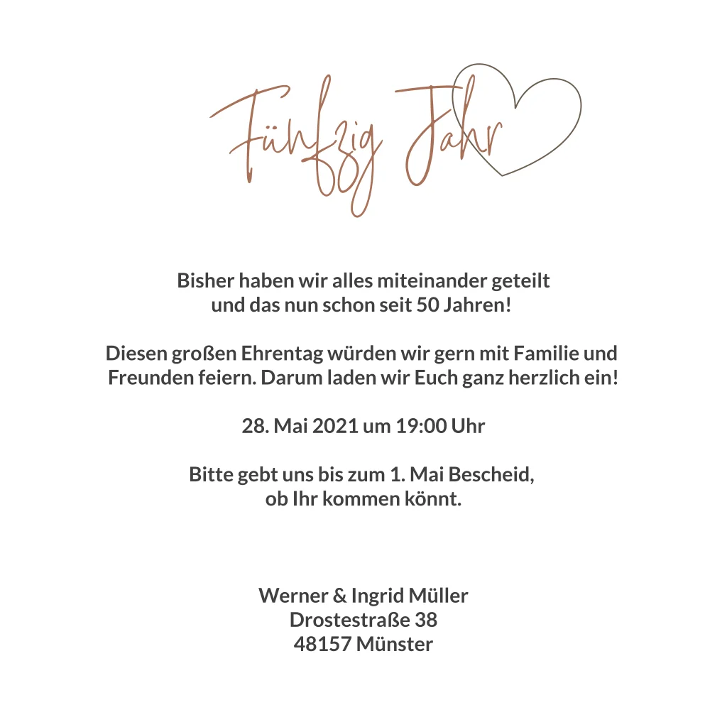 50 Jahre verheiratet, herzlichen Glückwunsch! Die Goldene Hochzeit ist ein wahrer Meilenstein. Als Belohnung für ein gemeinsames Leben, das alle Höhen und Tiefen überstanden hat, dürft Ihr jetzt Eure Goldene Hochzeit feiern! So ein besonderes Fest bedarf natürlich auch besonderer Einladungen. Die meisten Paare feiern Ihre Goldene Hochzeit gemeinsam mit der Familie und Freunden. Manche sehr groß, andere eher im kleinen Kreis. Genauso verschieden ist die Kartenauswahl zum Thema. Natürlich bietet sich für die Goldene 50 eine Goldveredelung hervorragend an.Bei quadratische Karten fällt ggf. ein anderes Briefporto an. Alle Infos findest du auf der Website der Deutschen Post. Zu diesem Format erhältst du Umschläge in der Größe 14x12,5 cm. Format ändern ist möglich.