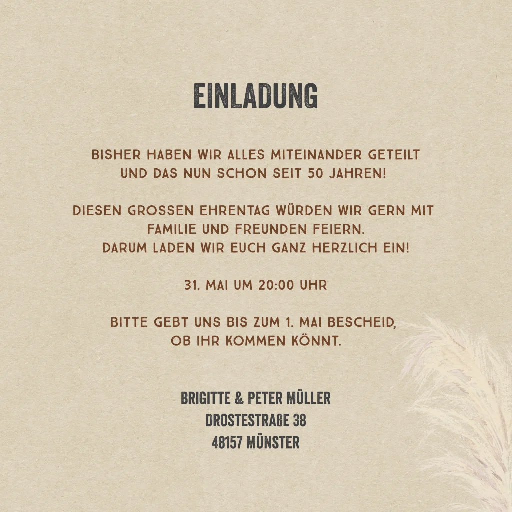 Einladung zur Goldenen Hochzeit mit Wegweiser und Gräsern