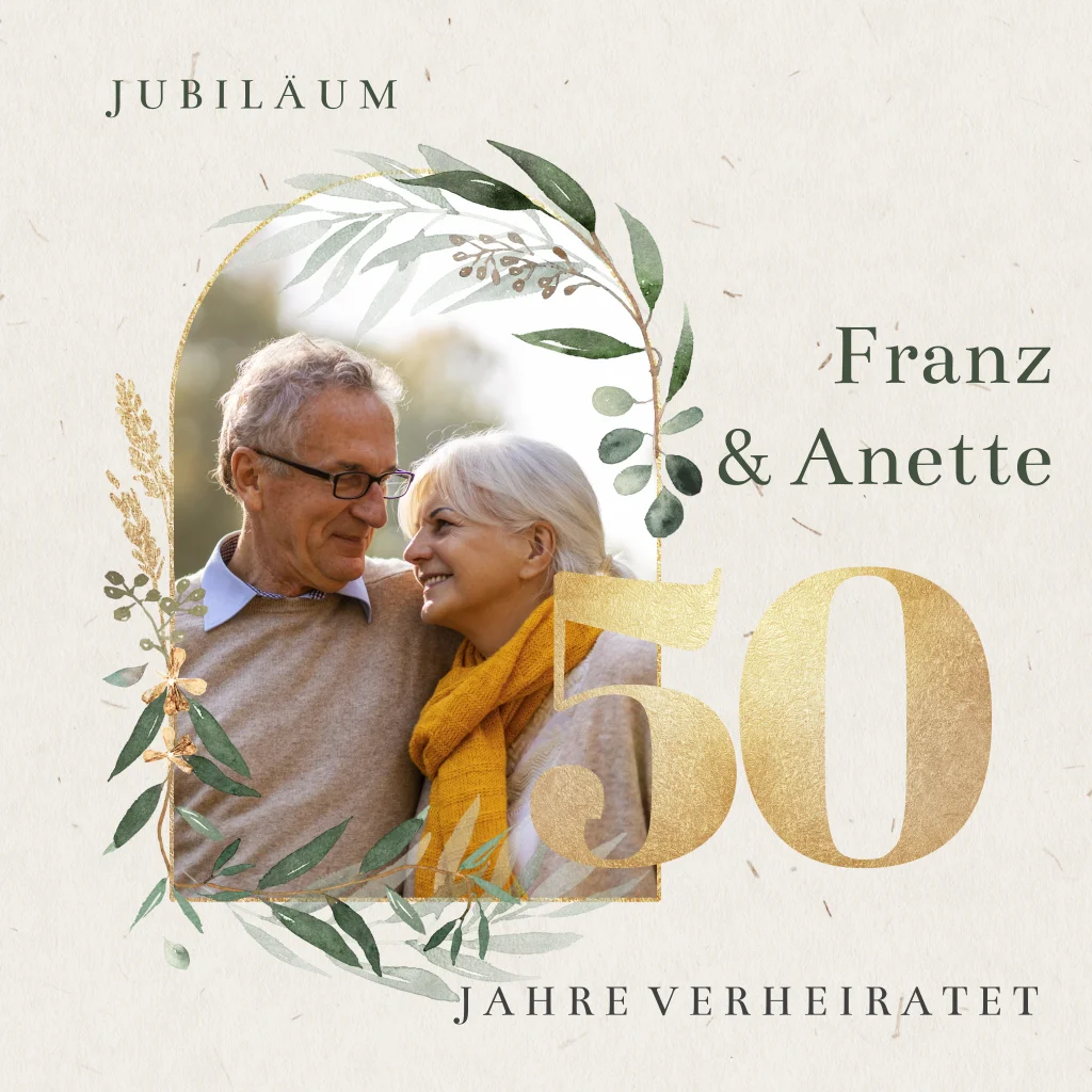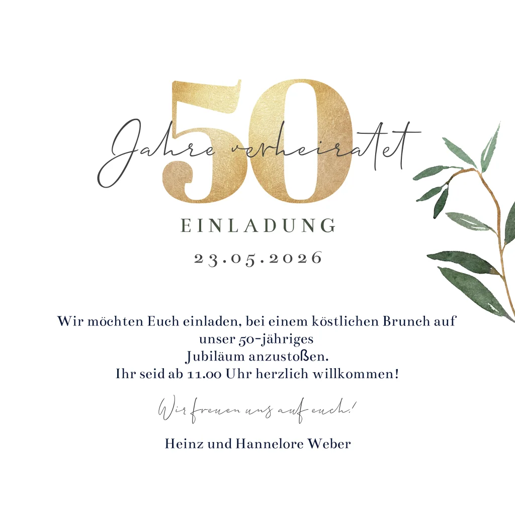 Botanische Einladung zur goldenen Hochzeit mit Bild und Zweigen