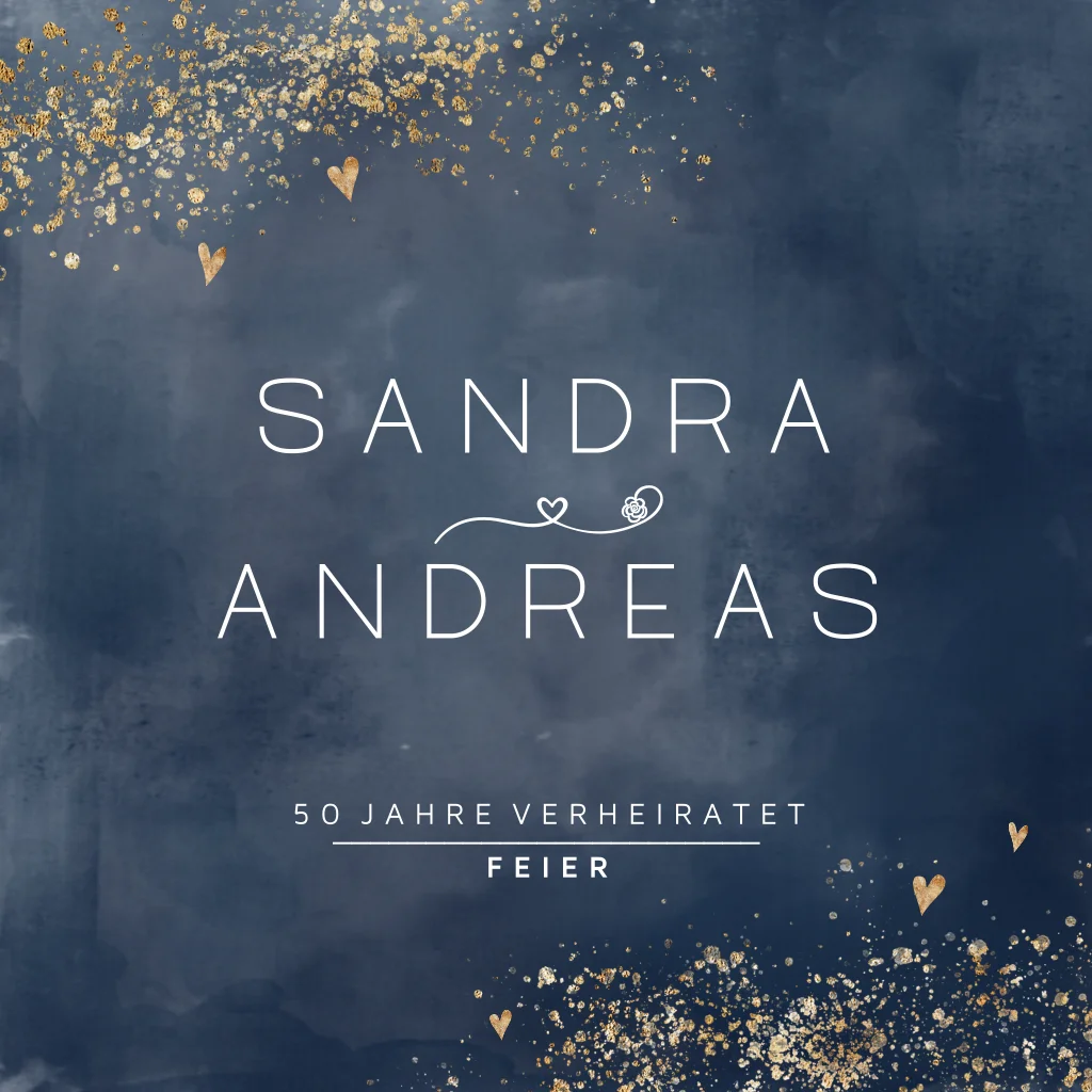 Schöne Jubiläumskarte für Ihren 50. Hochzeitstag. Der dunkelblaue Aquarell-Hintergrund und die goldenen Konfetti und Herzen verleihen dieser Karte einen stilvollen und festlichen Look. Passen Sie den Text auf der Karte im Online-Editor an.