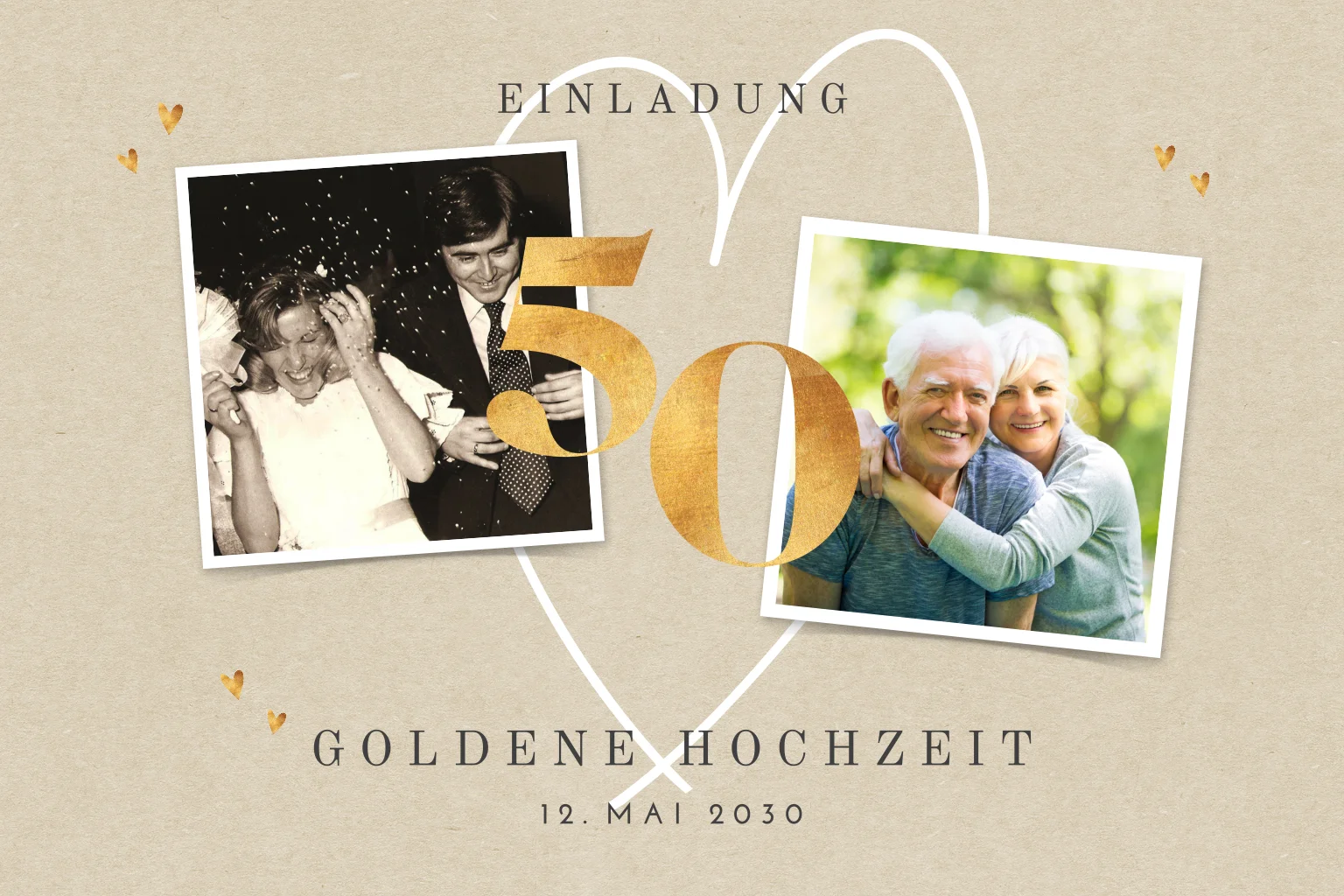 Schicke Einladung zur goldenen Hochzeit mit Fotos, Herz auf Sand-Hintergrund.
