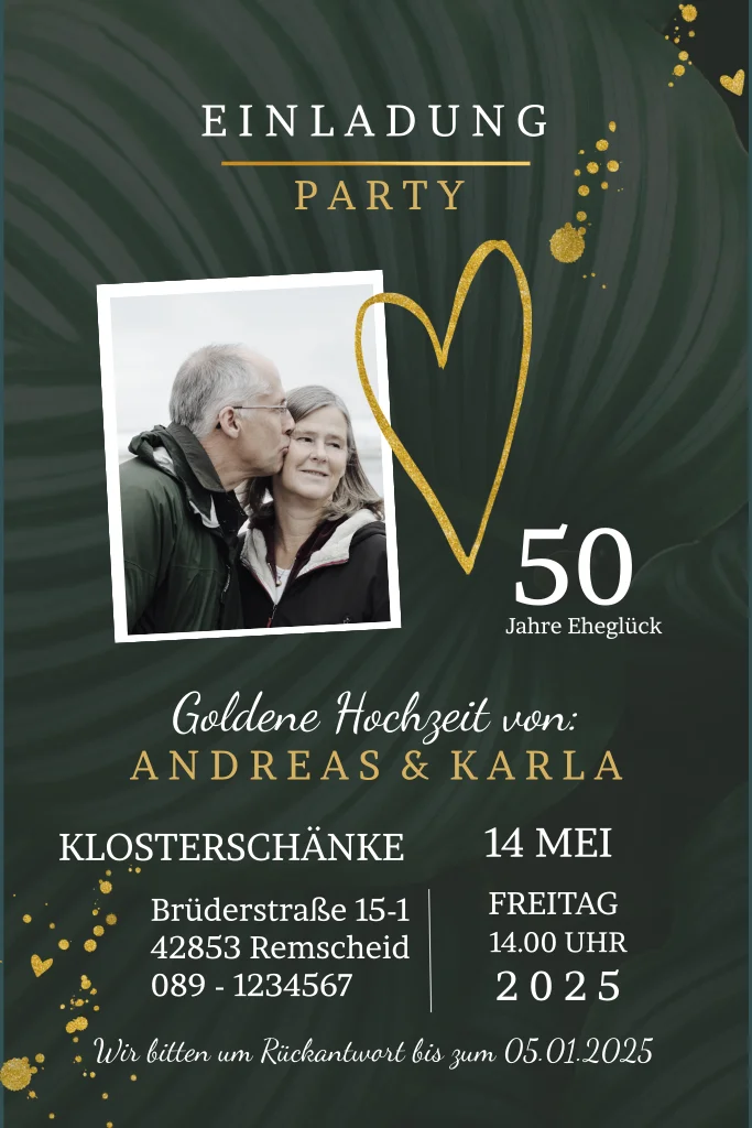 Festliche goldene Jubiläumskarte mit dunkelgrünem Blatt-Hintergrund. Die Vorderseite ist mit goldenen Details, Farbspritzern und Herzen verziert. Die Karte sieht stilvoll aus und bekommt die gewisse Persönliche Note, durch Ihr gemeinsames Foto. Nehmen Sie Veränderungen und Anpassungen einfach im Online-Editor vor.