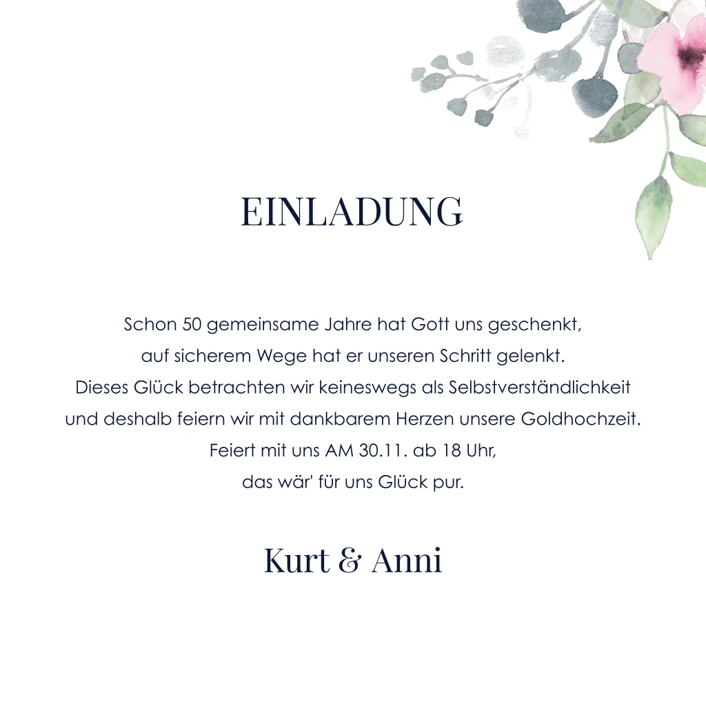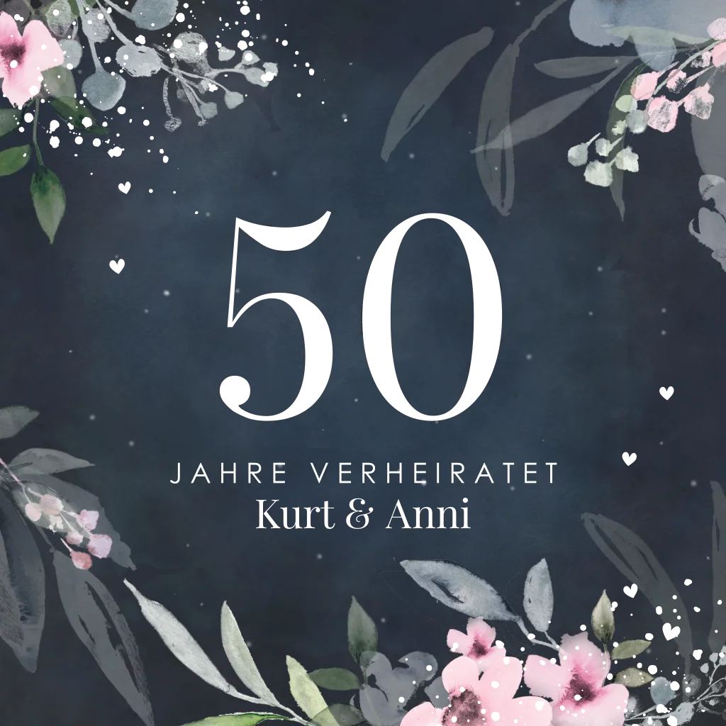 Einladung zur goldenen Hochzeit mit hübschen Blumen auf Dunklblau