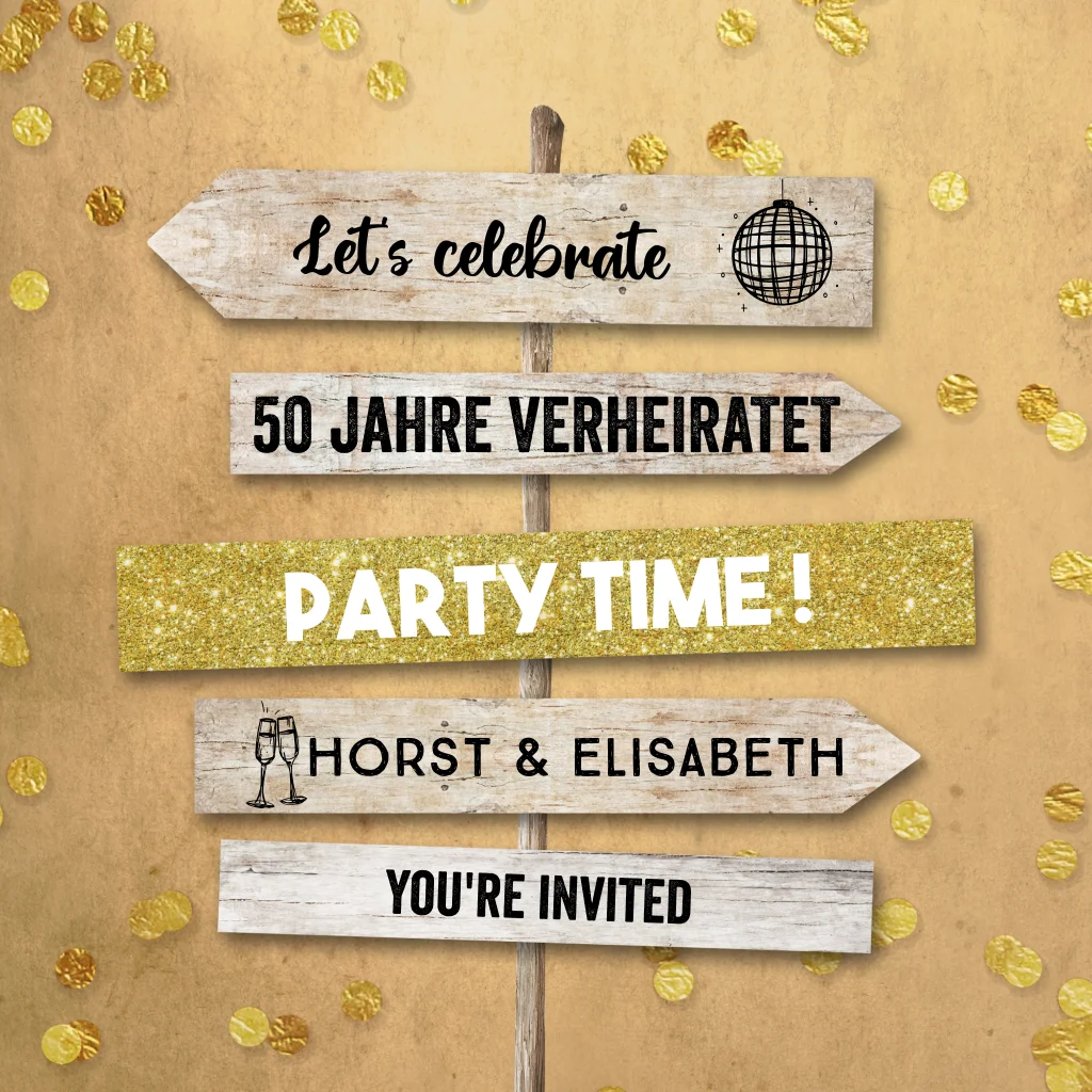 Einladung zur Goldenen Hochzeit mit Wegweiser und goldenem Konfetti