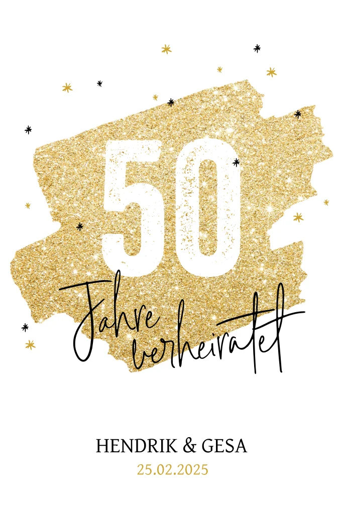 Eine festliche Einladung für ein 50-jähriges Jubiläum. Die goldenen Farbstreifen mit Glitzer sind ein schöner Hintergrund für die Zahl, die so wichtig ist, denn eine goldene Hochzeit ist ein großer Meilenstein!Eine festliche Einladung für ein 50-jähriges Jubiläum. Die goldenen Farbstreifen mit Glitzer sind ein schöner Hintergrund für die Zahl, die so wichtig ist, denn eine goldene Hochzeit ist ein großer Meilenstein!