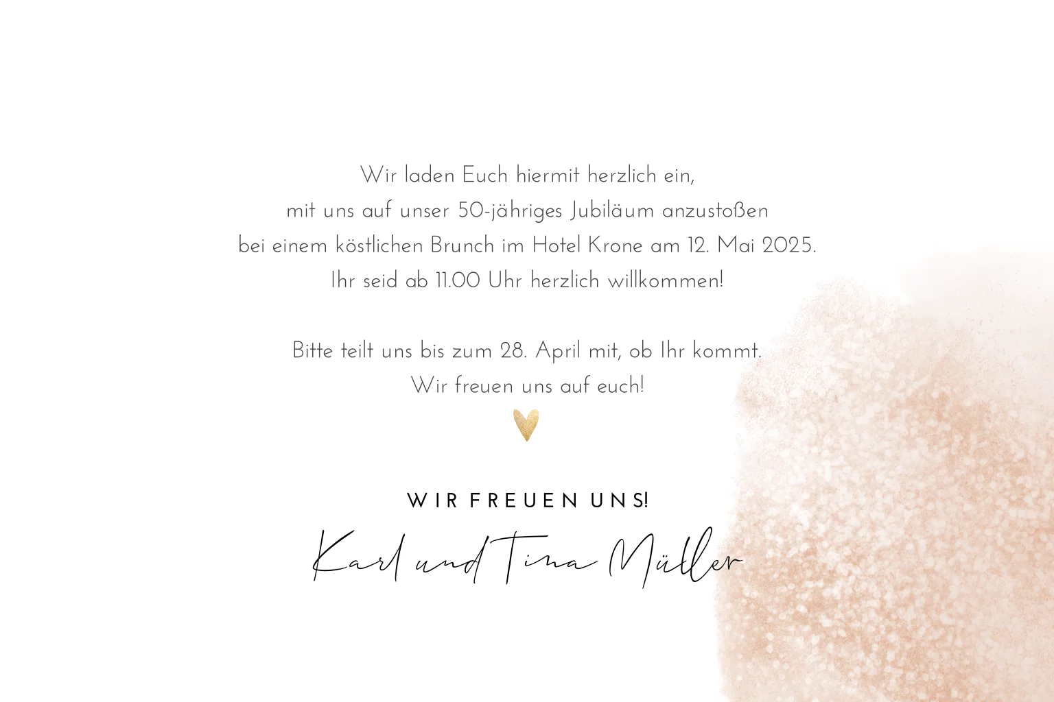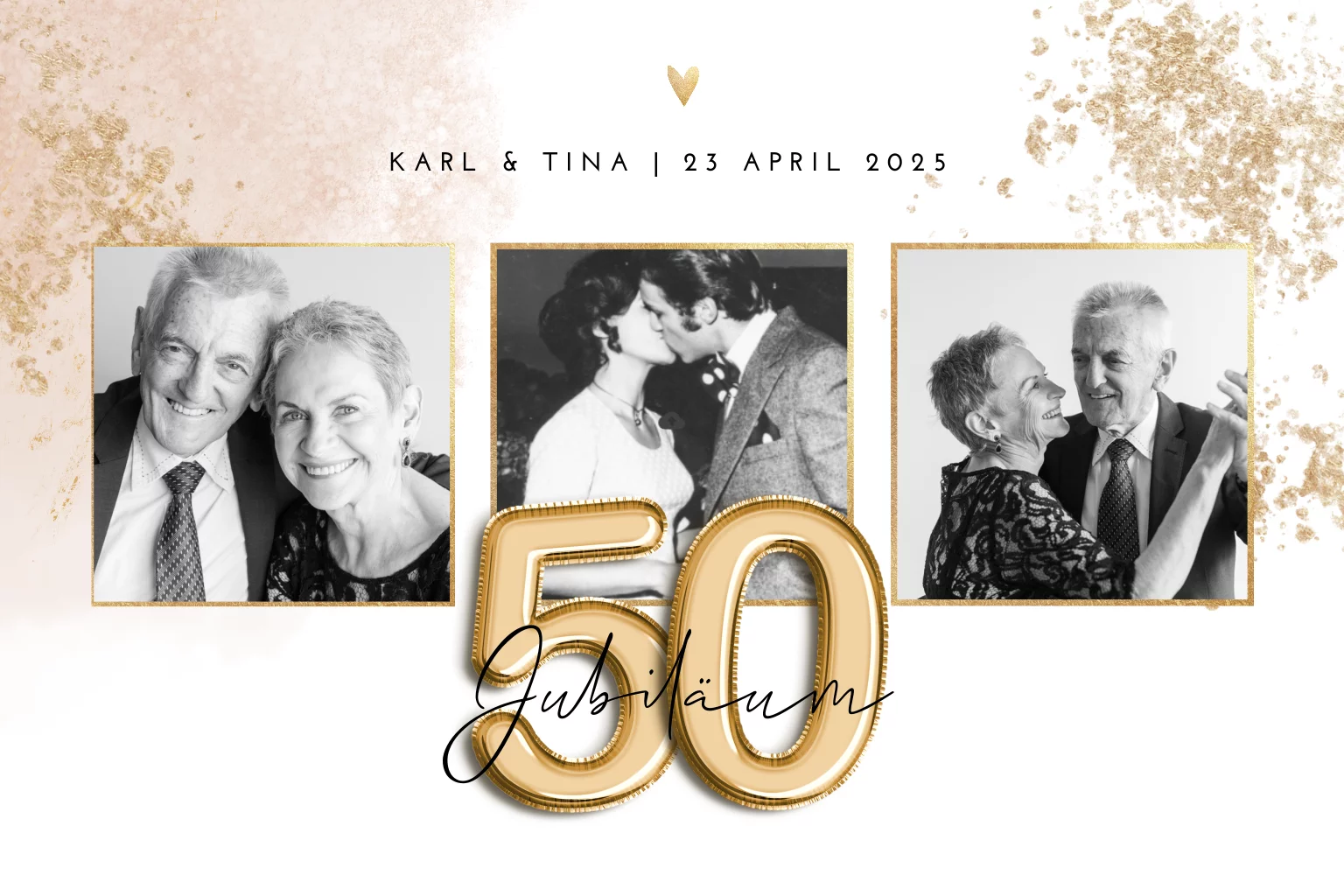 Stilvolle Einladungskarte zur Goldenen Hochzeit mit Bildern und Goldtupfern