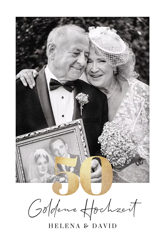 Einladungskarte zur Goldenen Hochzeit mit goldener 50 und Foto