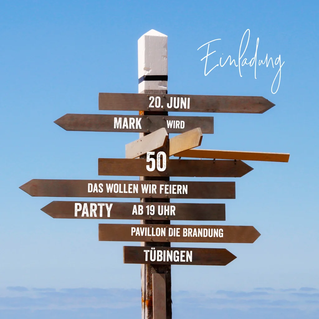 Eine passende Einladung zu jeder Party. Die Texte auf dem hölzernen Wegweiser lassen sich ganz nach deinen Wünschen anpassen. Der strahlend blaue Himmel im Hintergrund wirkt einladend und lässt Urlaubsgefühle entstehen.