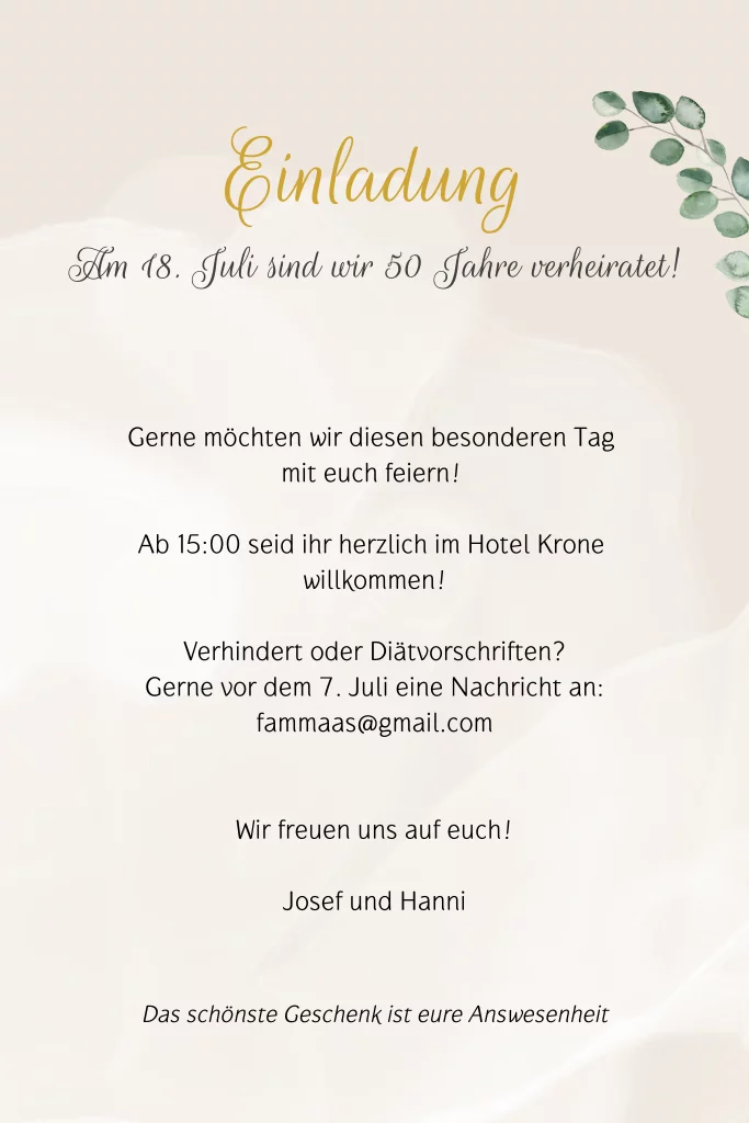 Einladungskarte mit goldener 50, geometrischen Figuren und Eukalyptus