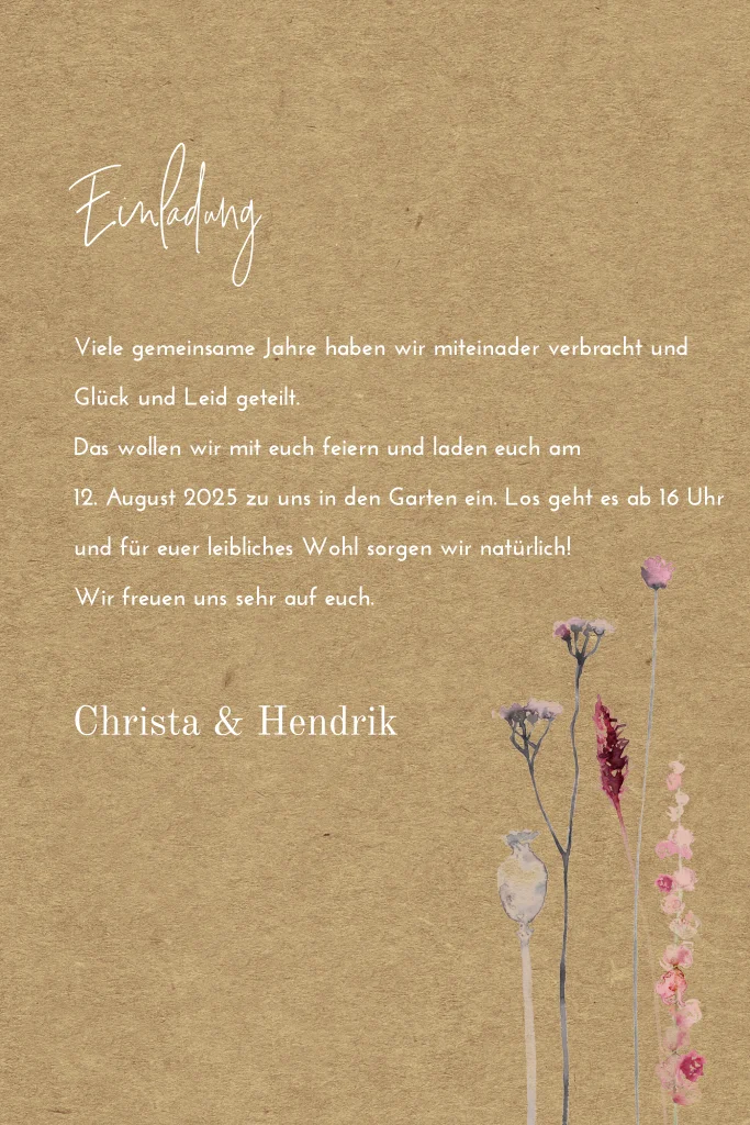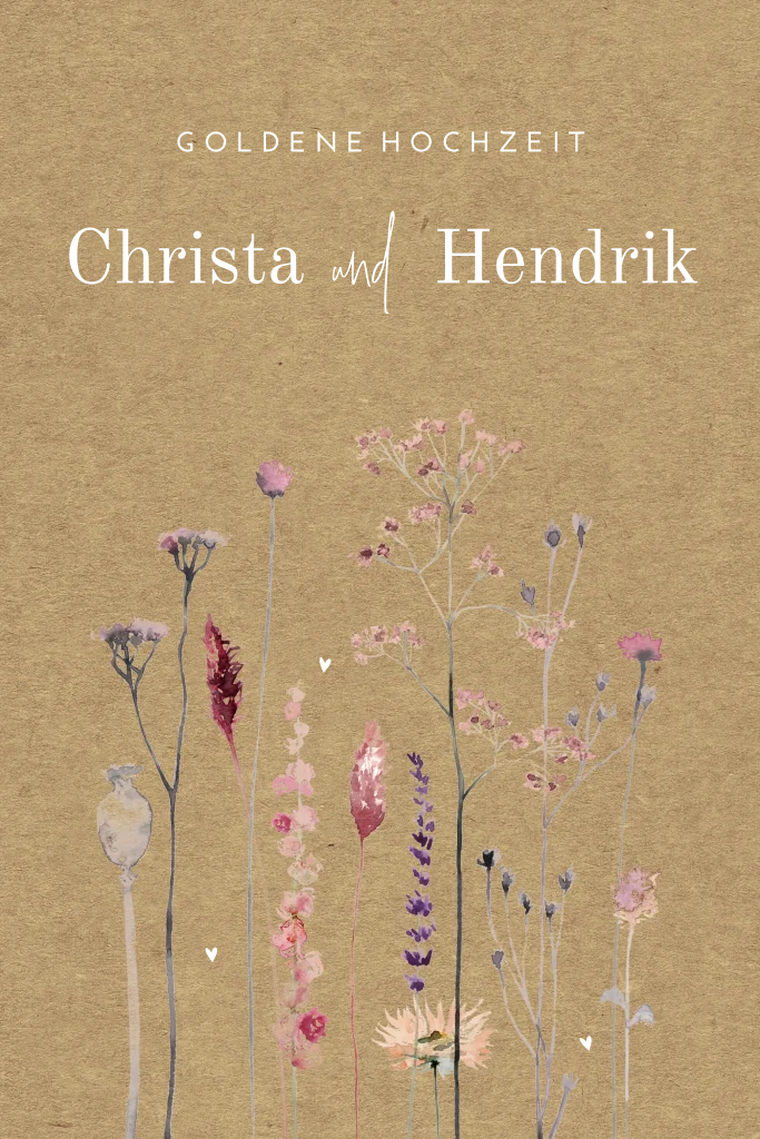 Elegante Einladung zur Goldenen Hochzeit mit Blumen mit Goldfolie und Kraftpapier-Look