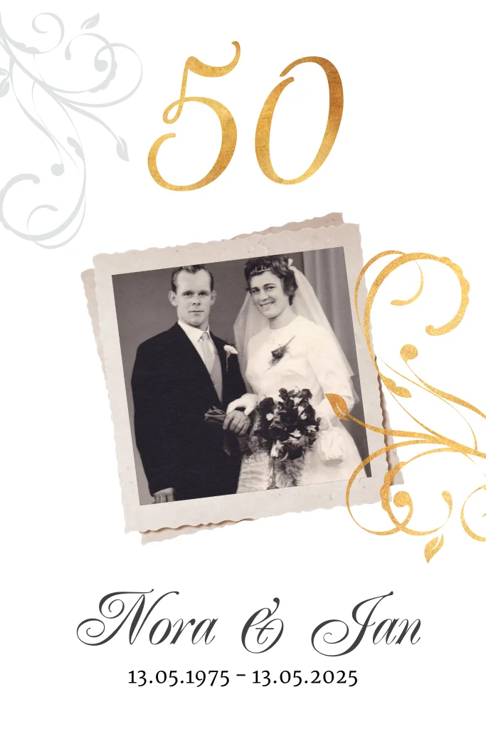 Elegante Einladung zur Goldenen Hochzeit in Gold mit Foto.