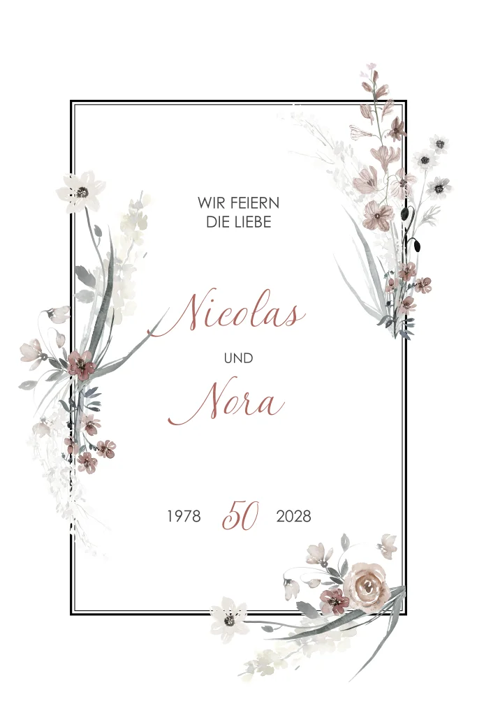 Elegante Einladung zur Goldenen Hochzeit mit rustikalen Blumen