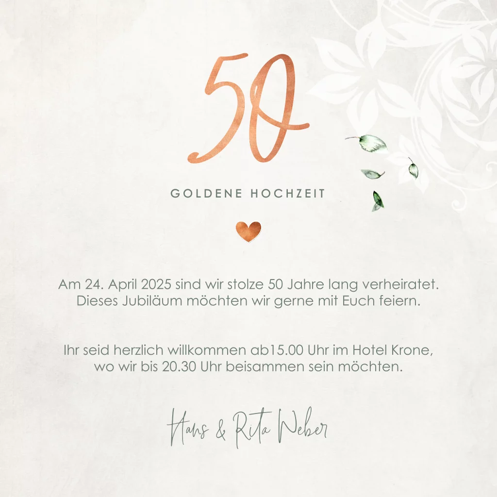 50 Jahre verheiratet, herzlichen Glückwunsch! Die Goldene Hochzeit ist ein wahrer Meilenstein. Als Belohnung für ein gemeinsames Leben, das alle Höhen und Tiefen überstanden hat, dürft Ihr jetzt Eure Goldene Hochzeit feiern! So ein besonderes Fest bedarf natürlich auch besonderer Einladungen. Die meisten Paare feiern Ihre Goldene Hochzeit gemeinsam mit der Familie und Freunden. manche sehr groß, andere eher im kleinen Kreis. Genauso verschieden ist die Kartenauswahl zum Thema. Erstellt selbst eure Einladung auf dieser quadratischen, doppelt gefalteten Karte mit Eukalyptuszweigen und romantischen Ornamenten.