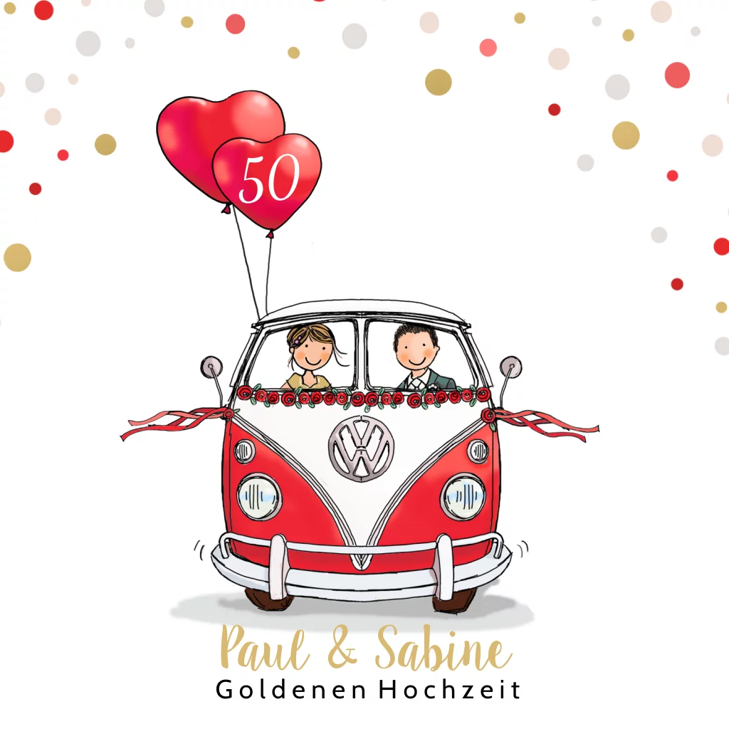 Lustige Einladung zum 50-jährigen Jubiläum mit rotem Van und Konfetti