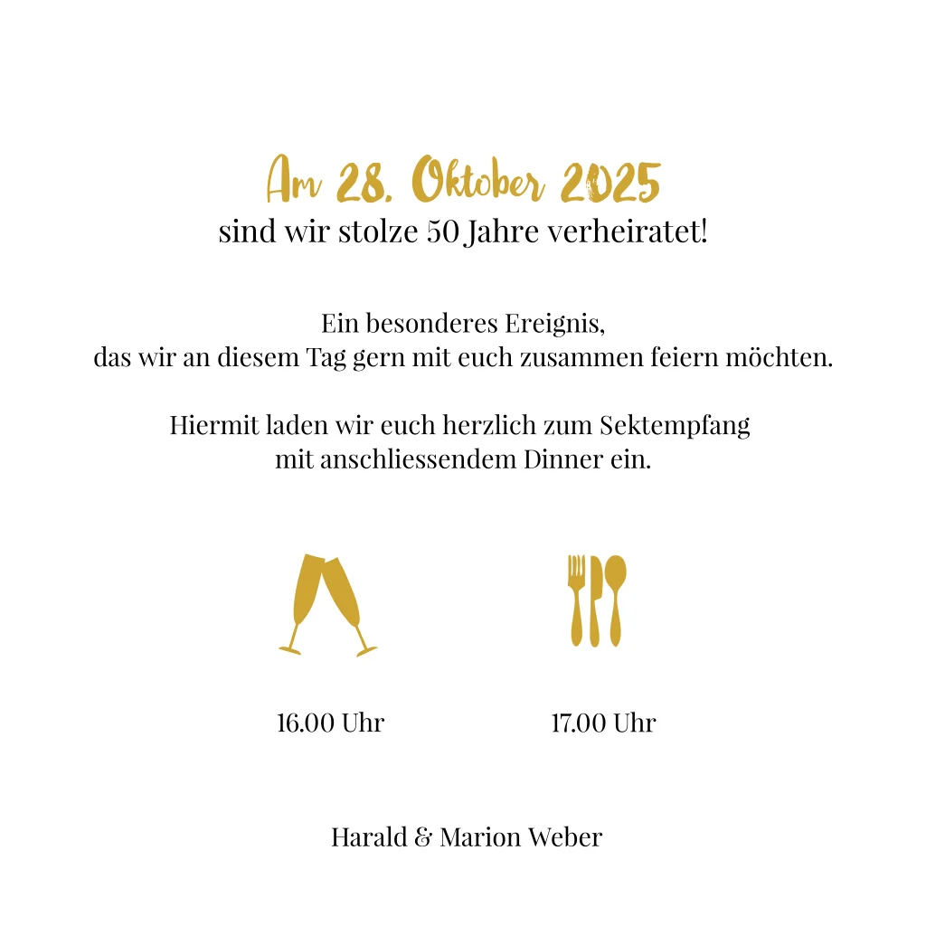 50 Jahre verheiratet, herzlichen Glückwunsch! Die Goldene Hochzeit ist ein wahrer Meilenstein. Als Belohnung für ein gemeinsames Leben, das alle Höhen und Tiefen überstanden hat, dürft Ihr jetzt Eure Goldene Hochzeit feiern! So ein besonderes Fest bedarf natürlich auch besonderer Einladungen. Die meisten Paare feiern Ihre Goldene Hochzeit gemeinsam mit der Familie und Freunden. manche sehr groß, andere eher im kleinen Kreis. Genauso verschieden ist die Kartenauswahl zum Thema. Natürlich bietet sich für die Goldenen 50 eine Goldveredelung hervorragend an. Erstellt selbst eure Hochzeitskarte auf dieser modernen, quadratischen, doppelt gefalteten Karte.