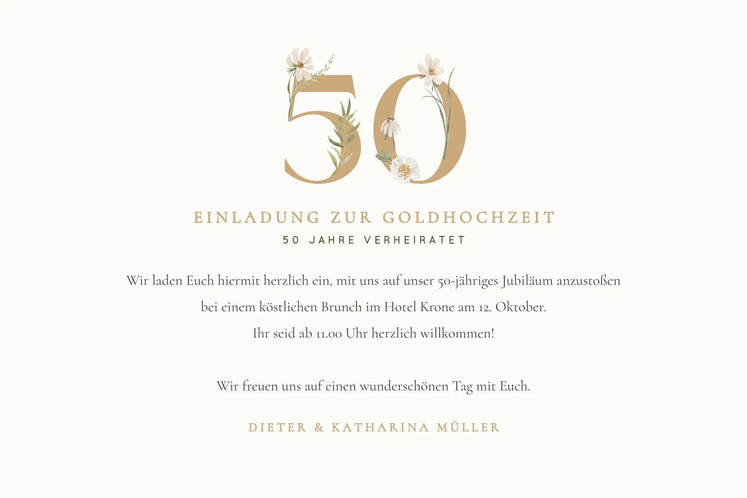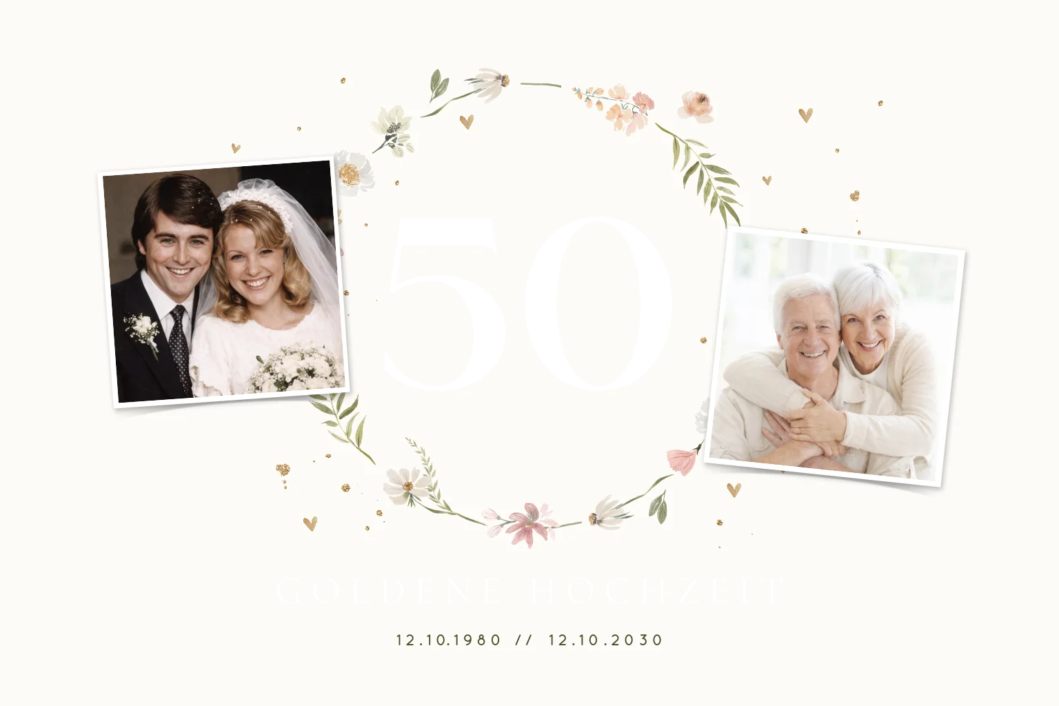 Romantische Einladung zur Goldenen Hochzeit mit Blumenkranz und Mattgoldfolie