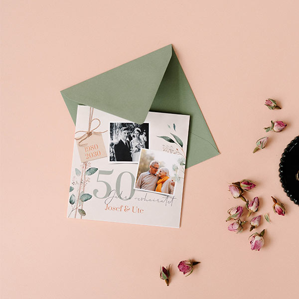 Rustikale Einladung zur goldenen Hochzeit mit Bildern und Zweigen
