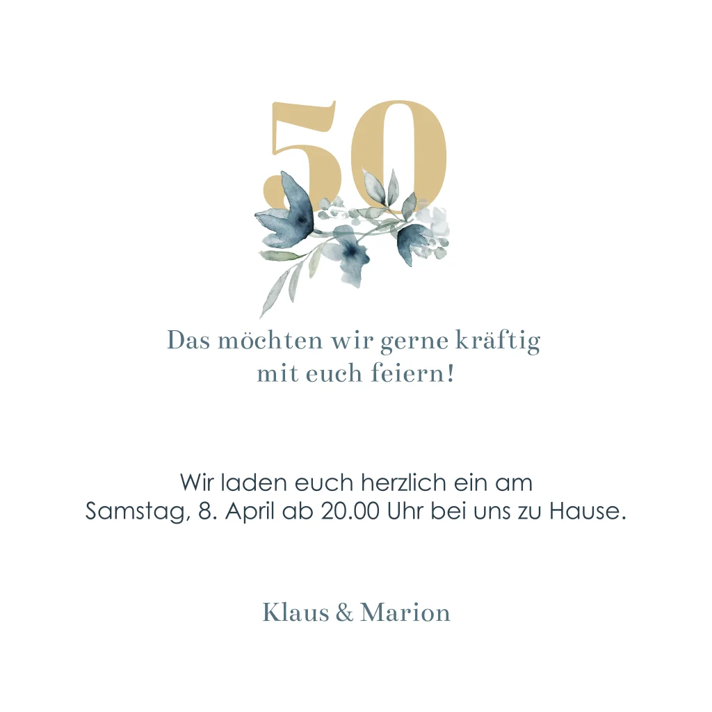 Schicke dunkelblaue Einladung zur goldenen Hochzeit mit Blumenkranz