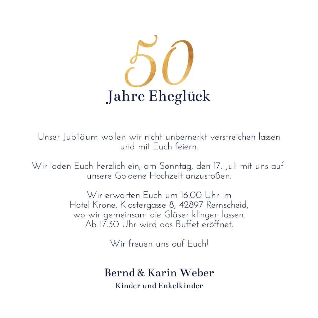 50 Jahre verheiratet, herzlichen Glückwunsch! Die Goldene Hochzeit ist ein wahrer Meilenstein. Als Belohnung für ein gemeinsames Leben, das alle Höhen und Tiefen überstanden hat, dürft Ihr jetzt Eure Goldene Hochzeit feiern! So ein besonderes Fest bedarf natürlich auch besonderer Einladungen. Die meisten Paare feiern Ihre Goldene Hochzeit gemeinsam mit der Familie und Freunden. manche sehr groß, andere eher im kleinen Kreis. Genauso verschieden ist die Kartenauswahl zum Thema. Natürlich bietet sich für die Goldenen 50 eine Goldveredelung hervorragend an. Diese quadratische, doppelt gefaltete Karte hat eine romantische Ausstrahlung.