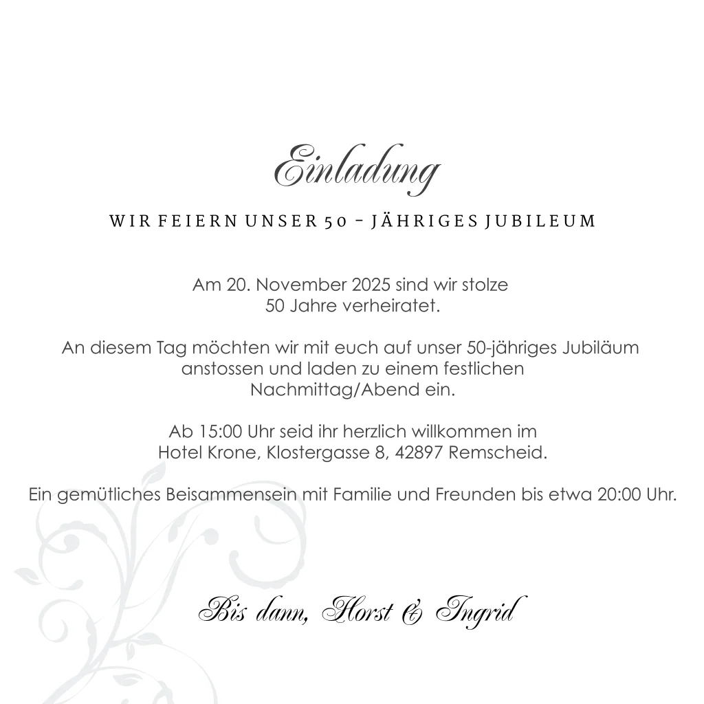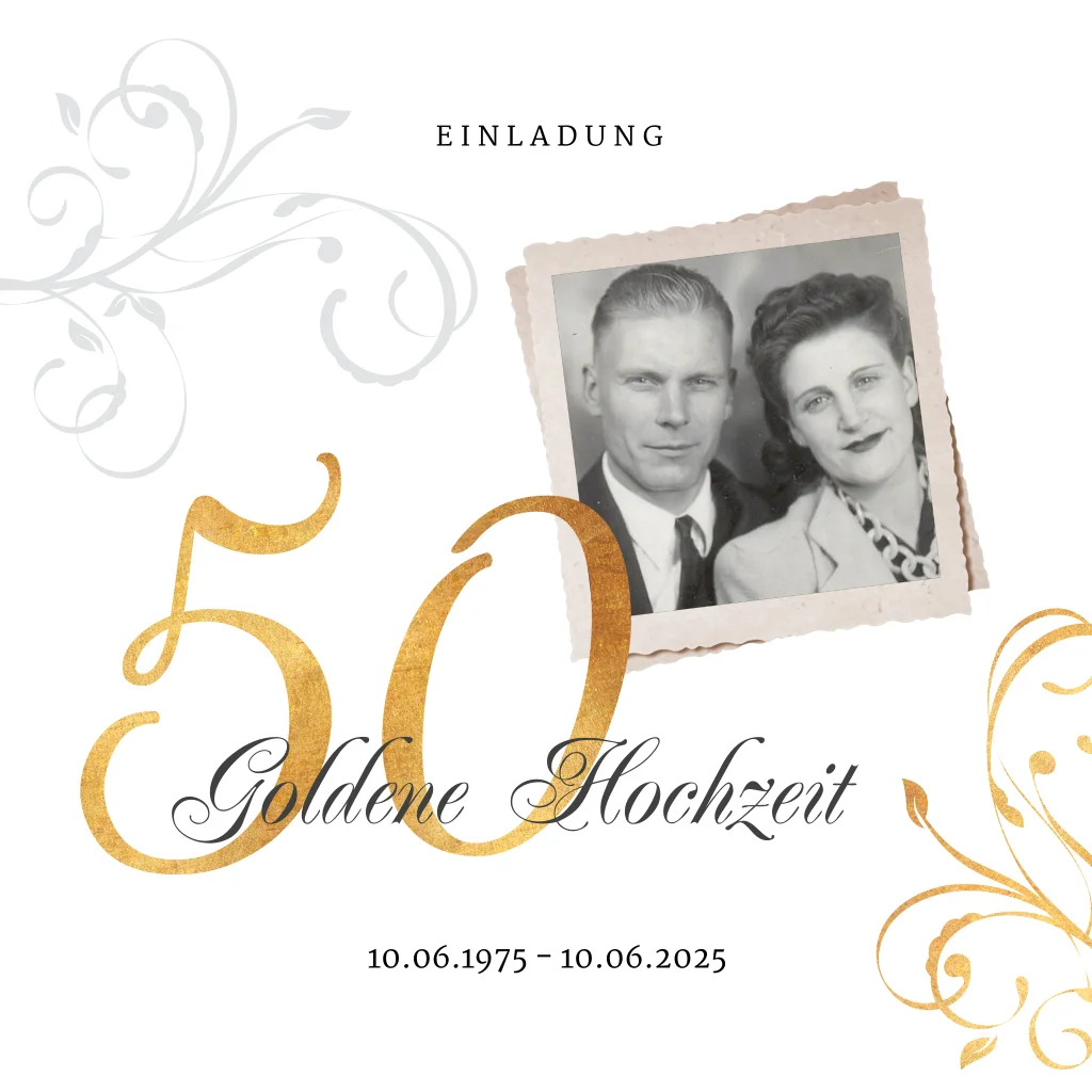 Schicke verschnörkelte Einladung zur goldenen Hochzeit mit Foto.